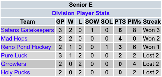 Satan’s Gatekeepers continue to lead the E-League power rankings. They were undefeated after week three. The Mad Hops are second in the power rankings. They also remained undefeated after not playing in week three. Reno Pond Hockey is in the fourth spot. They won their week three game to remain undefeated in regulation. Pure Luck are in the fourth spot. They did not move after a loss. The Grrrowlers did not move after back to back losses to start the season. The Holy Pucks are in the last spot after losing two games in a row to start the season.