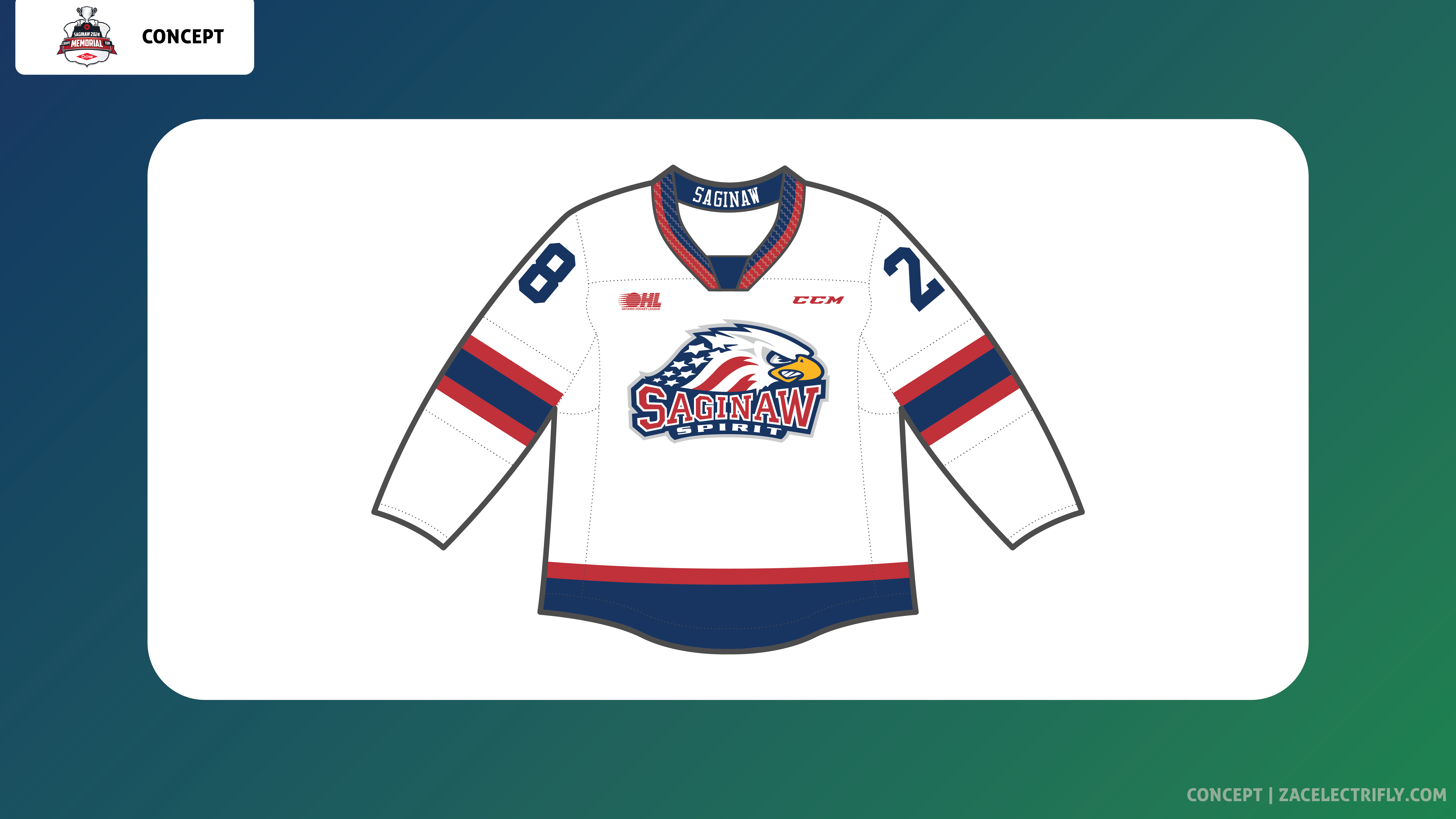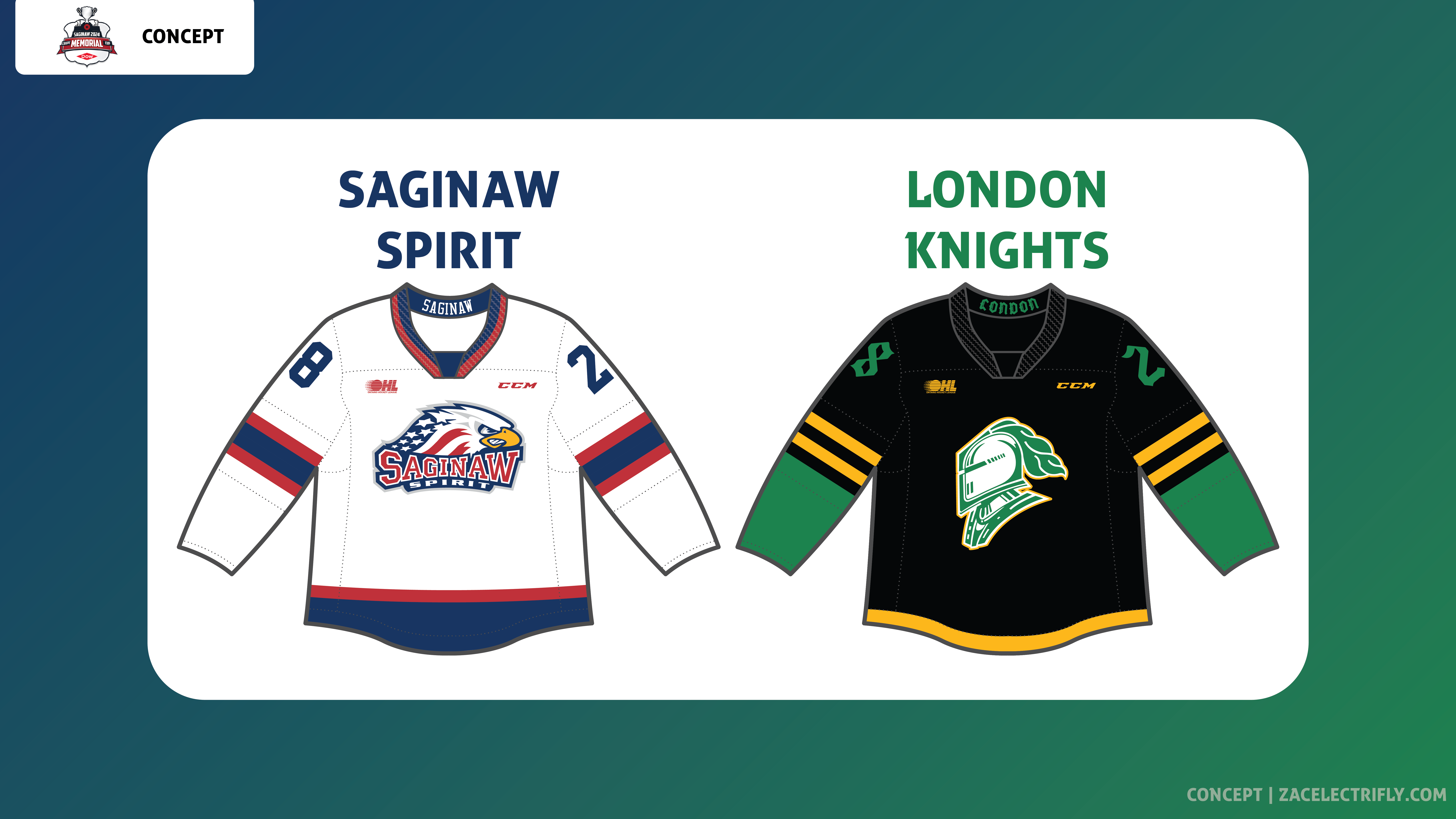 The Canadian Hockey Leagues Memorial Cup is the top junior hockey tournament in North America. The final was between The Saginaw Spirit of the Ontario Hockey League and the London Knights of the Ontario Hockey League. The 2024 CHL Memorial Cup final took place at the 5,527 capacity Dow Event Center in Saginaw, Michigan. The Saginaw Spirit won the game 4-3. This concept will be like my 2024 IIHF World Juniors Concept, my 2024 NCAA Division I Men’s Ice Hockey Championship Concept, and my 2024 Professional Women’s Hockey League Finals Concept.