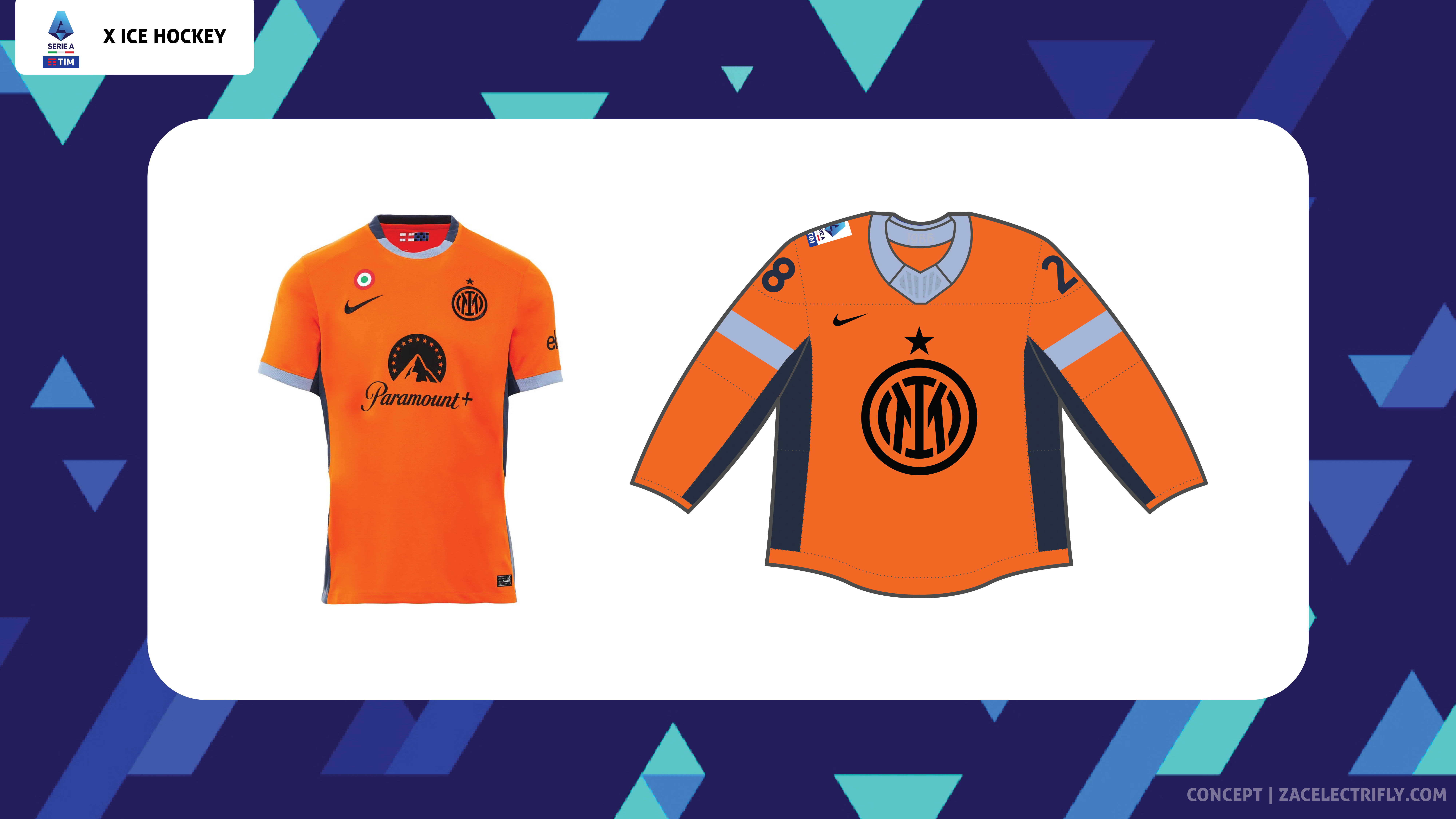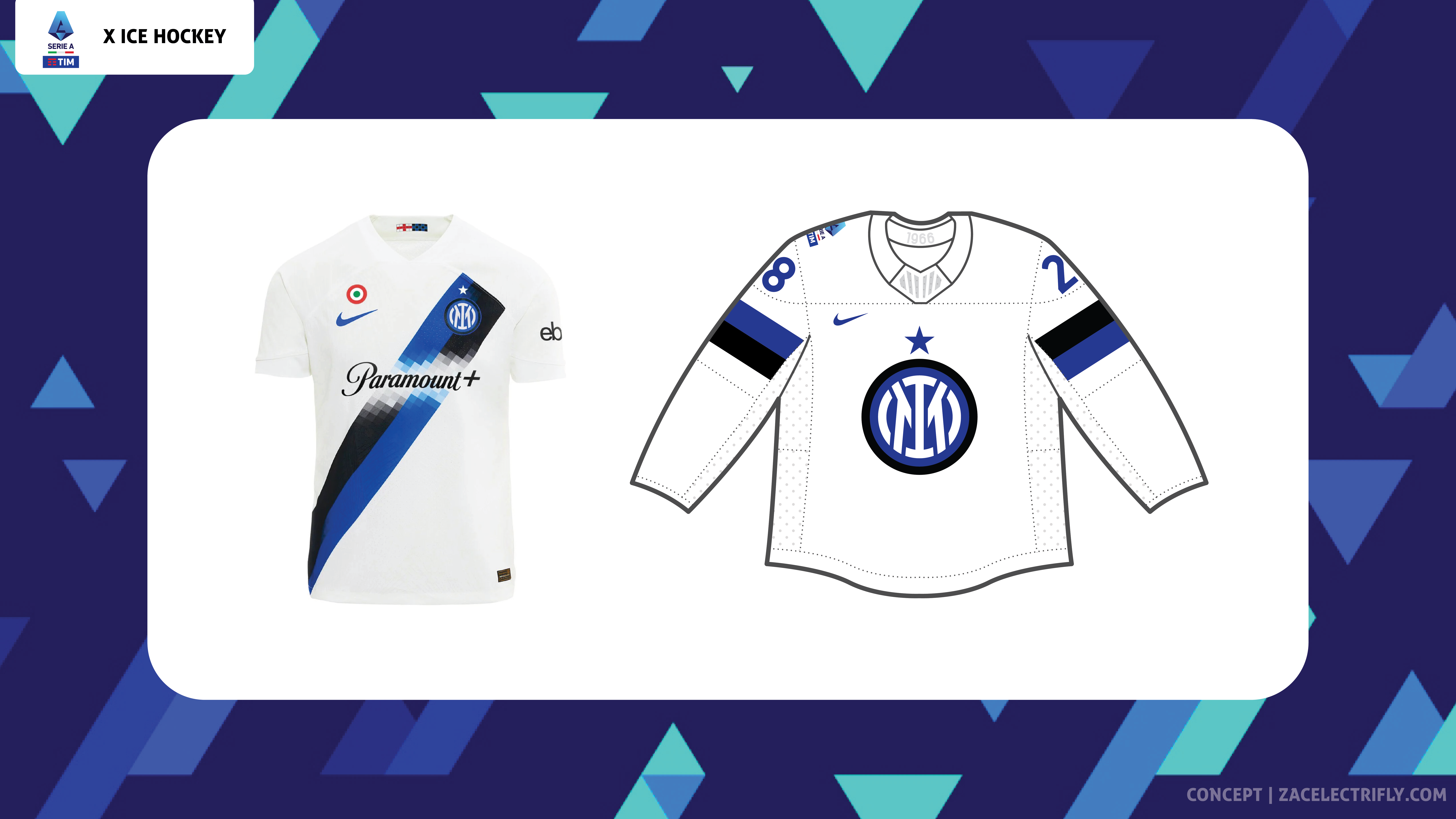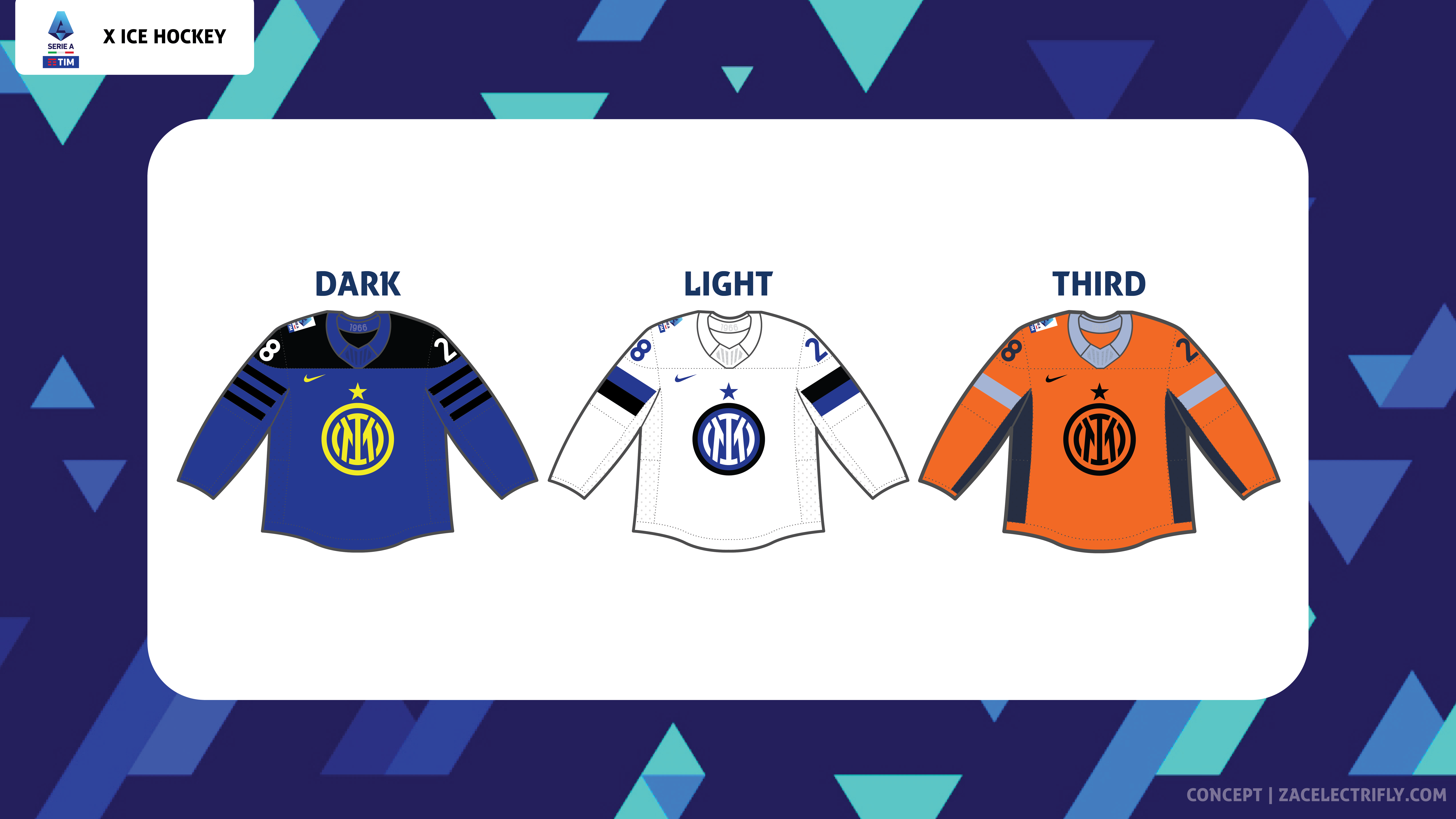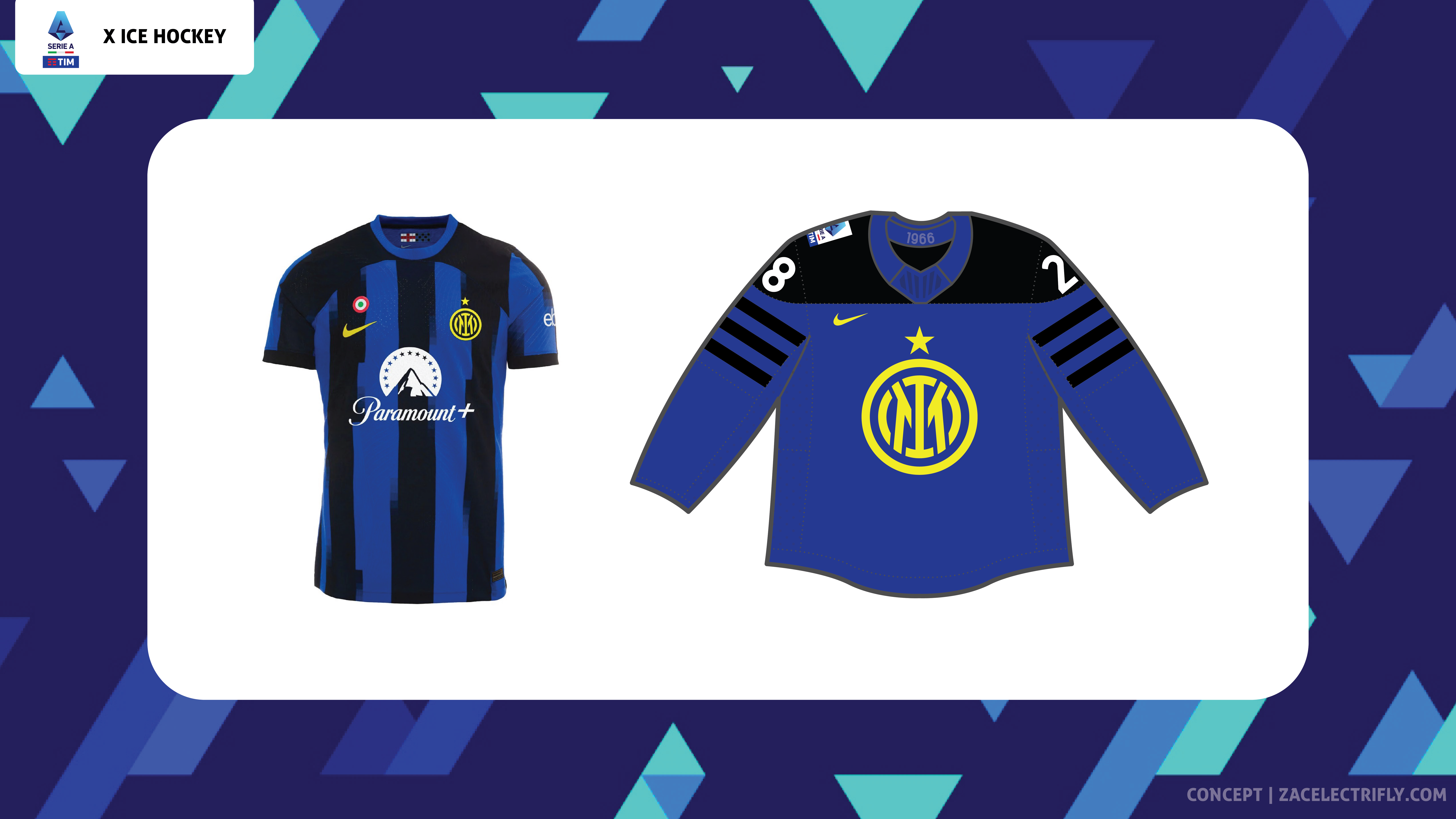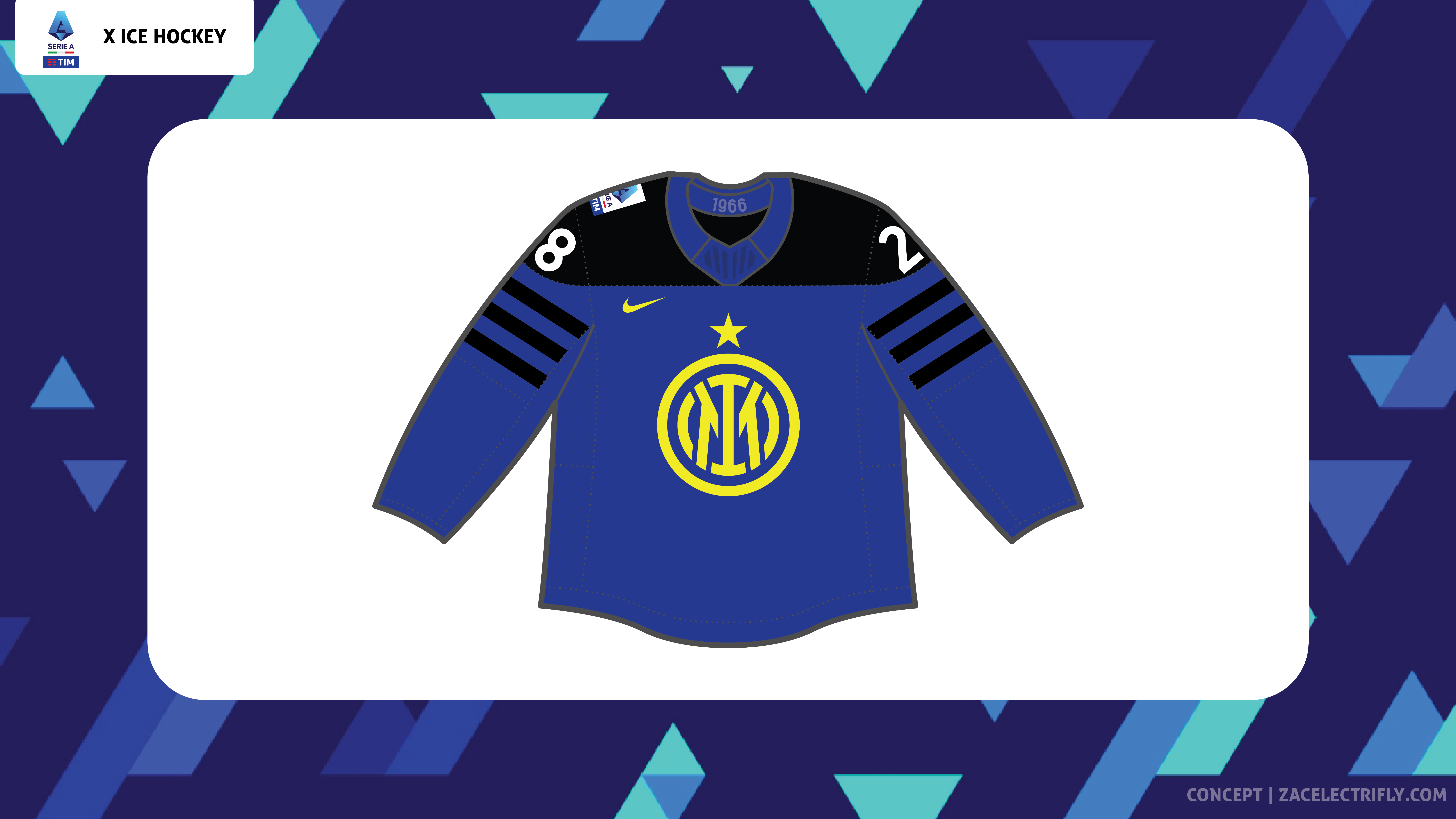 Serie A is the top professional soccer league in the Italian football league system. Serie A is home to teams such as Atalanta BC, ACF Fiorentina, Inter Milan, Juventus FC, AC Milan, SSC Napoli, and AS Roma. Serie A finished the 2023-24 season at the beginning of this month. All twenty clubs participated in thirty eight games. Serie A does not have a playoffs. The team leading the standings at the end of the season wins the league with the top five teams qualifying for next seasons UEFA Champions League. In this concept I will be reimagining the 2023-24 Serie A champions as an ice hockey team. Inter Milan won the 2023-24 Serie A championship. This concept will be like my Qatar 2022 Ice Hockey Concept, my FIFA Women’s World Cup 2023 Ice Hockey Concept, my 2023 MLS Cup X Ice Hockey Concept, my 2024 UEFA Champions League Final Ice Hockey Concept, and my 2024 CONCACAF Champions Cup Final Ice Hockey Concept.