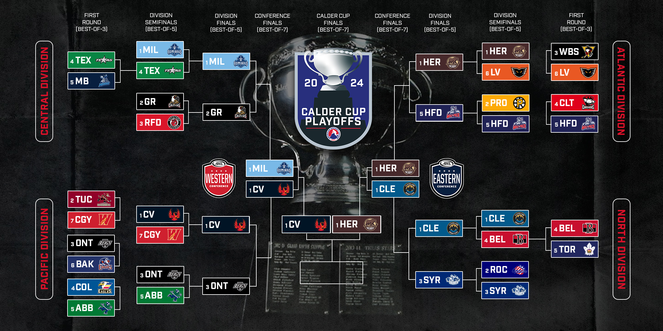 The Hershey Bears swept the Hartford Wolf Pack 3-0 in the Atlantic Division Finals. The Cleveland Monsters swept the Syracuse Crunch 3-0 in the North Division Finals. The Milwaukee Admirals beat the Grand Rapids Griffins 3-2 in the Central Division Finals. The Coachella Valley Firebirds beat the Ontario Reign 3-0 in the Pacific Division Finals. The Grand Rapids Griffins were the only team to not get swept in the divisional finals.