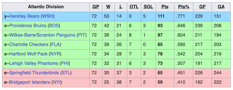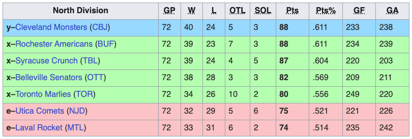 The Hershey Bears, Providence Bruins, Wilkes-Barre/Scranton Penguins, Charlotte Checkers, Hartford Wolf Pack, and Lehigh Valley Phantoms all qualified for the playoffs in the Atlantic Division. The Cleveland Monsters, Rochester Americans, Syracuse Crunch, Belleville Senators, and Toronto Marlies qualified for the playoffs in the North Division. The Milwaukee Admirals, Grand Rapids Griffins, Rockford IceHogs, Texas Stars, and Manitoba Moose qualified for the playoffs in the Central Division. The Coachella Valley Firebirds, Tucson Roadrunners, Ontario Reign, Colorado Eagles, Abbotsford Canucks, Bakersfield Condors, and Calgary Wranglers qualified for the playoffs in the Pacific Division.