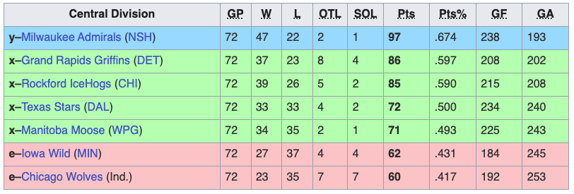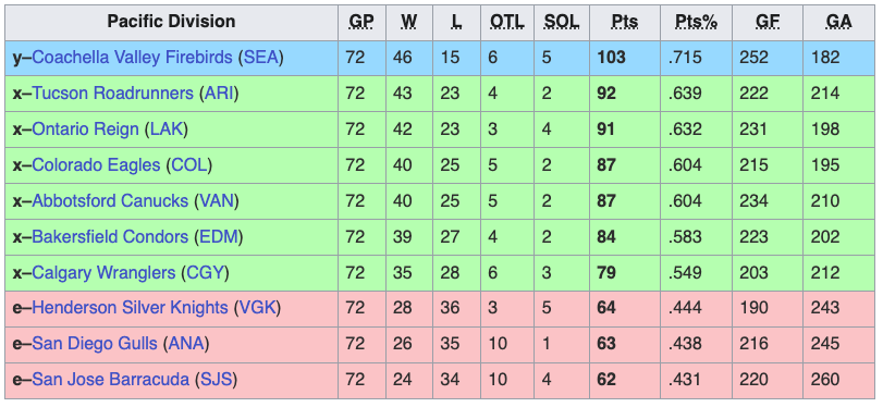 The Springfield Thunderbirds, Bridgeport Islanders, Utica Comets, Laval Rocket, Iowa Wild, Chicago Wolves, Henderson Silver Knights, San Diego Gulls, and San Jose Barracuda were eliminated from playoff contention. The Bridgeport Islanders were the worst team in the AHL this season. They finished the regular season with just 59 points.