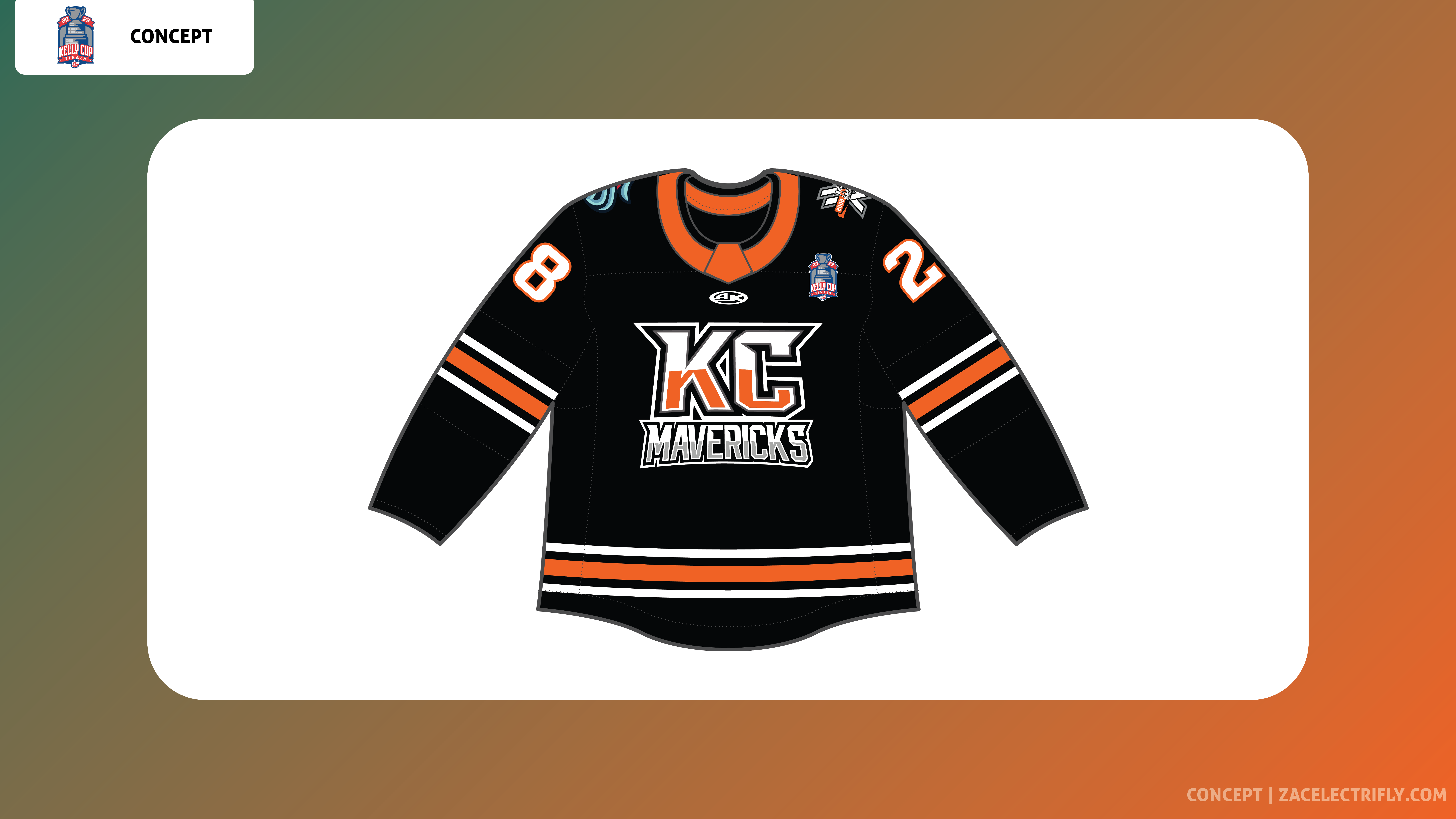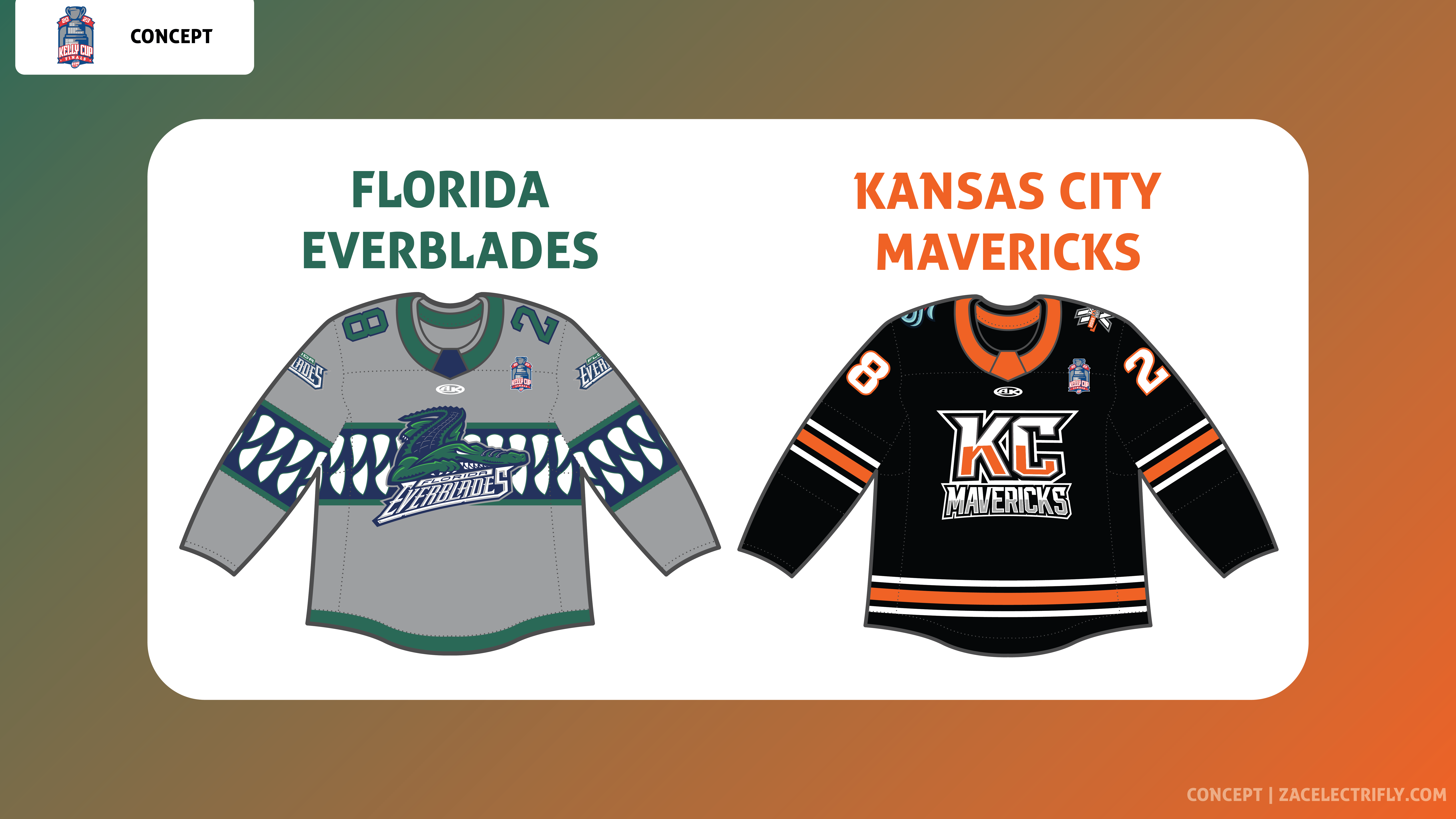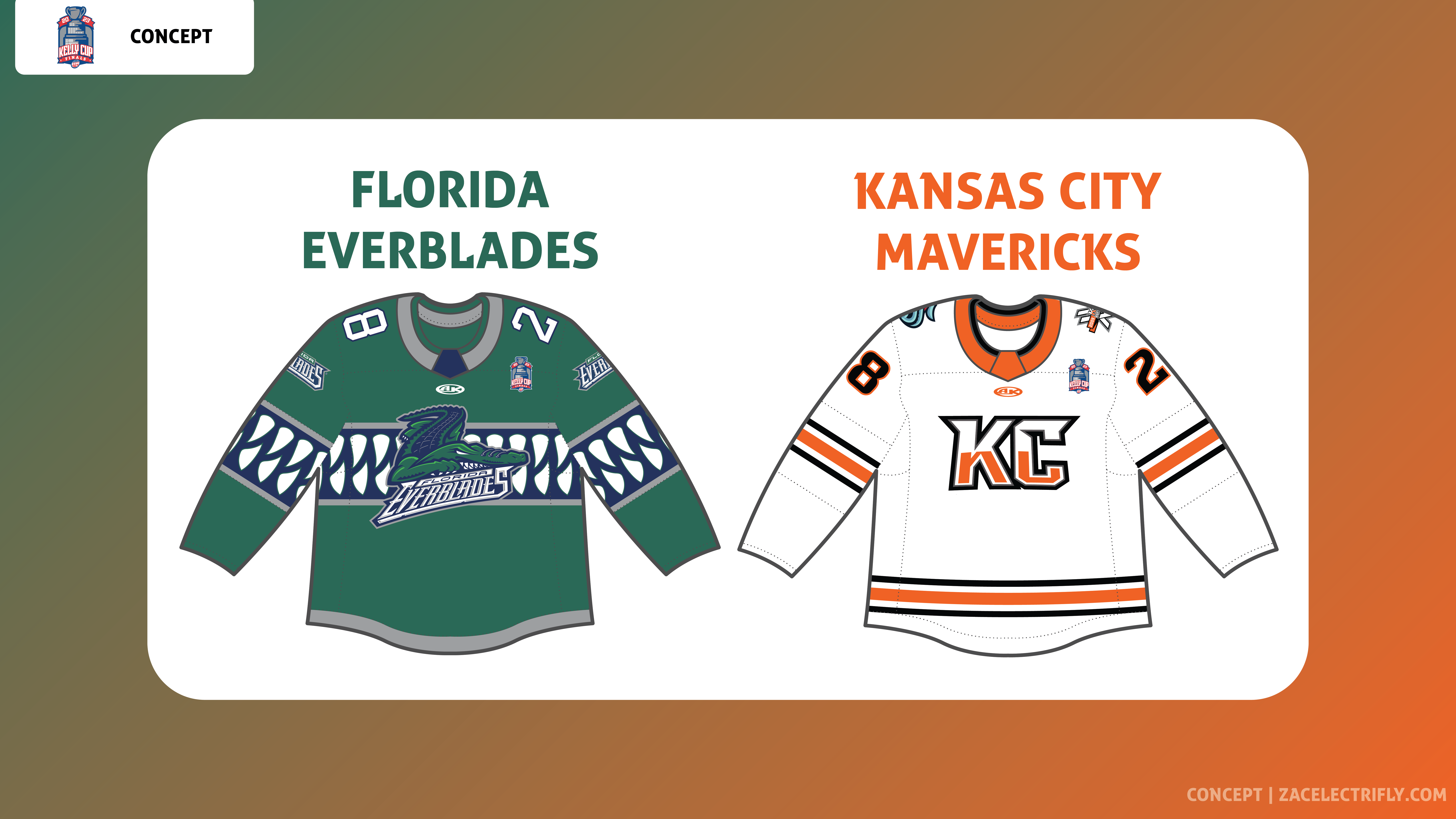 Both teams are sponsored by Athletic Knit. Athletic Knit provides uniforms for the entire ECHL. The Florida Everblades home jersey is grey, green, blue, and white. The pattern on the jersey is inspired by their past jerseys and the Florida Panthers jerseys. The jersey does include gator teeth which is what the Everblades jerseys have become known for. On the front is the primary logo. On the sleeves is the woodmark logo. The number placement and sleeve placement have been flipped. Also on the front is the Kelly Cup Finals logo. The everblades away jersey is green, blue, grey, and white. It has the same pattern and logos as the home jersey. The Kansas City Mavericks home jersey is white, orange, and black. On the front is their secondary logo. Also on the front is the Kelly cup Finals logo. On the shoulders are the Seattle Kraken logo and their anniversary logo. The Mavericks away jersey is black, orange, and white. On the front is the primary logo. Also on the front is the Kelly Cup Finals logo. On the shoulders are the Seattle Kraken logo and their anniversary logo. Games in Florida would have a grey against black jersey matchup. Games in Kansas City would have a white against green matchup.