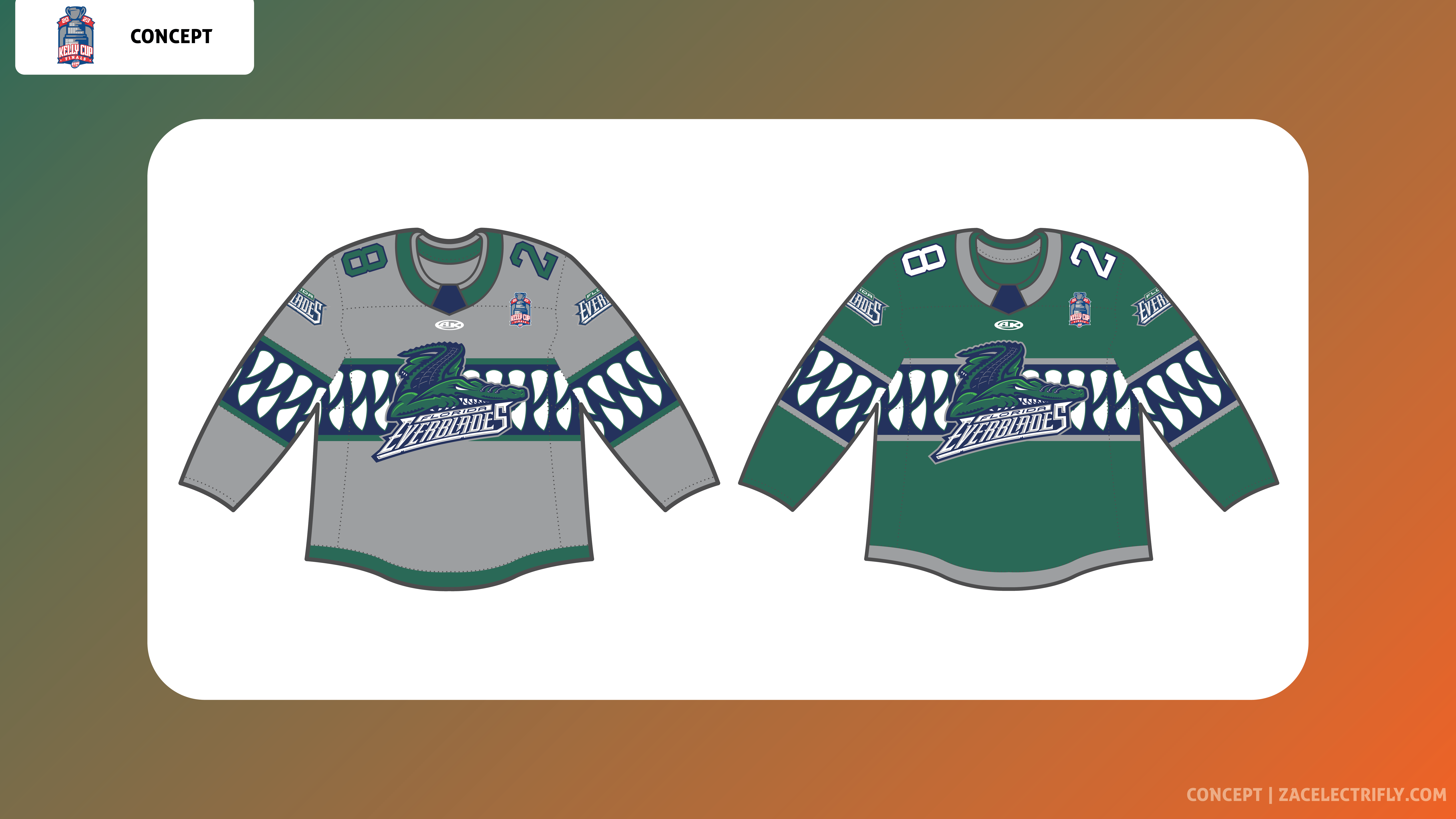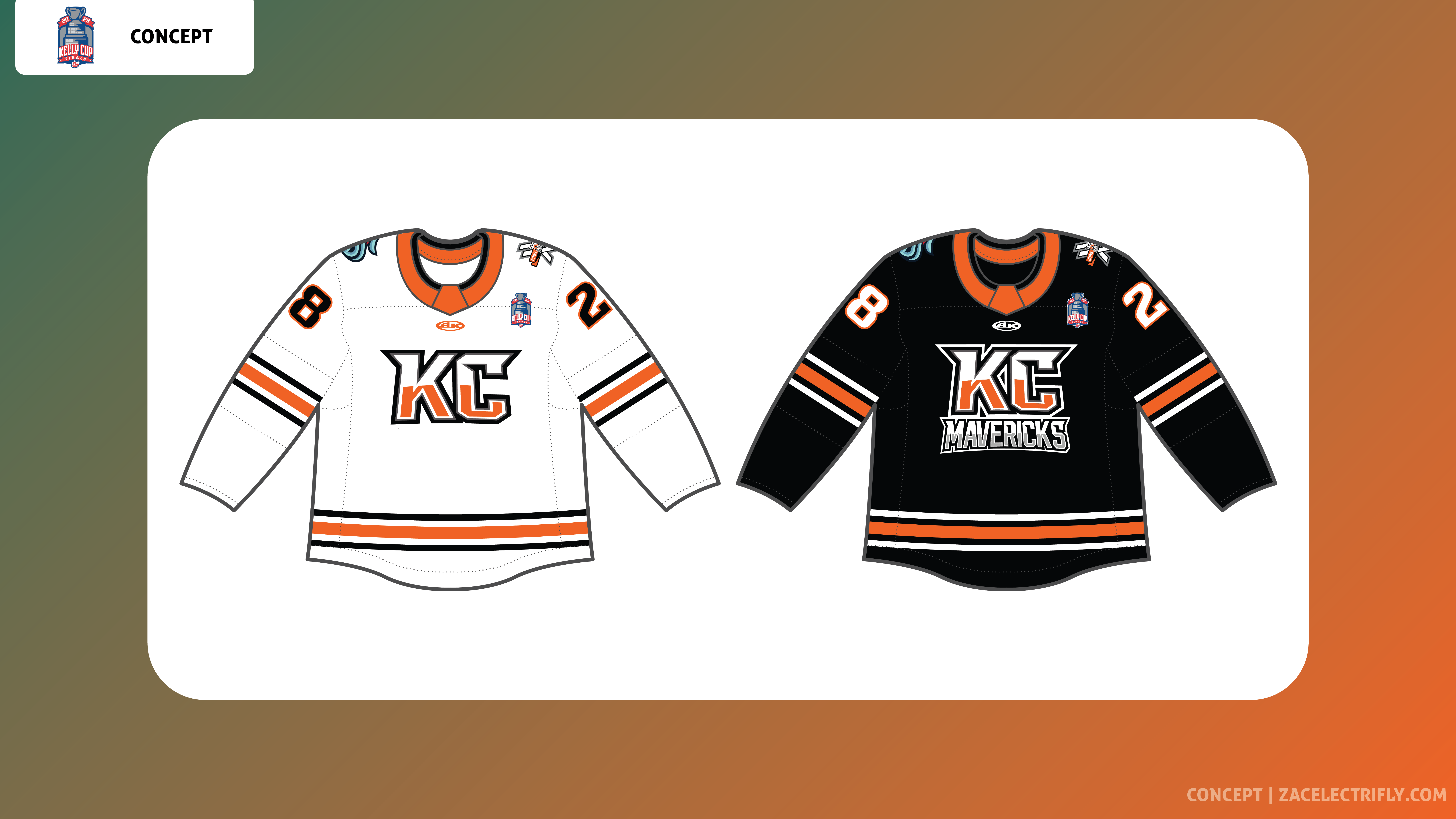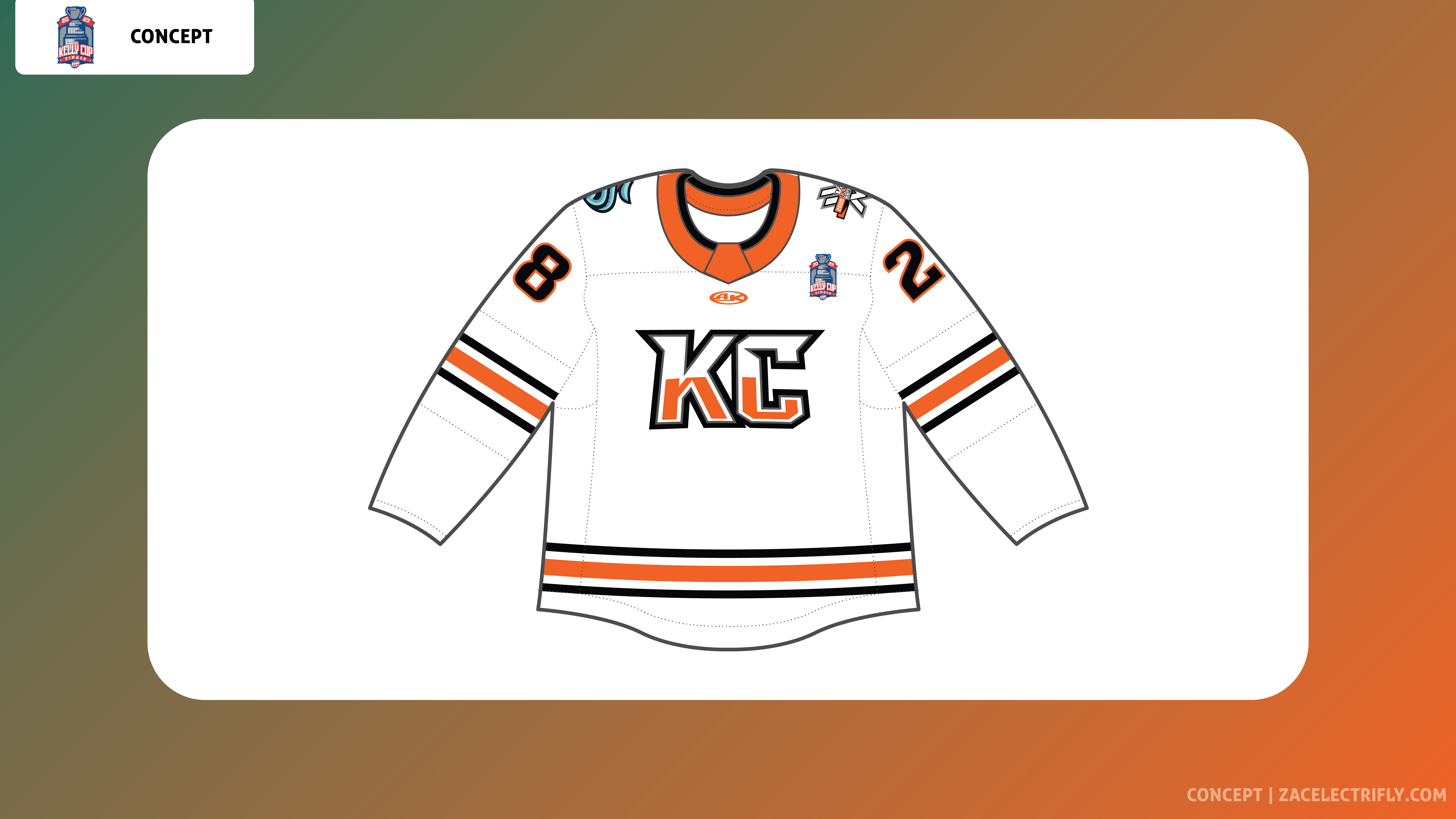 Both teams are sponsored by Athletic Knit. Athletic Knit provides uniforms for the entire ECHL. The Florida Everblades home jersey is grey, green, blue, and white. The pattern on the jersey is inspired by their past jerseys and the Florida Panthers jerseys. The jersey does include gator teeth which is what the Everblades jerseys have become known for. On the front is the primary logo. On the sleeves is the woodmark logo. The number placement and sleeve placement have been flipped. Also on the front is the Kelly Cup Finals logo. The everblades away jersey is green, blue, grey, and white. It has the same pattern and logos as the home jersey. The Kansas City Mavericks home jersey is white, orange, and black. On the front is their secondary logo. Also on the front is the Kelly cup Finals logo. On the shoulders are the Seattle Kraken logo and their anniversary logo. The Mavericks away jersey is black, orange, and white. On the front is the primary logo. Also on the front is the Kelly Cup Finals logo. On the shoulders are the Seattle Kraken logo and their anniversary logo. Games in Florida would have a grey against black jersey matchup. Games in Kansas City would have a white against green matchup.