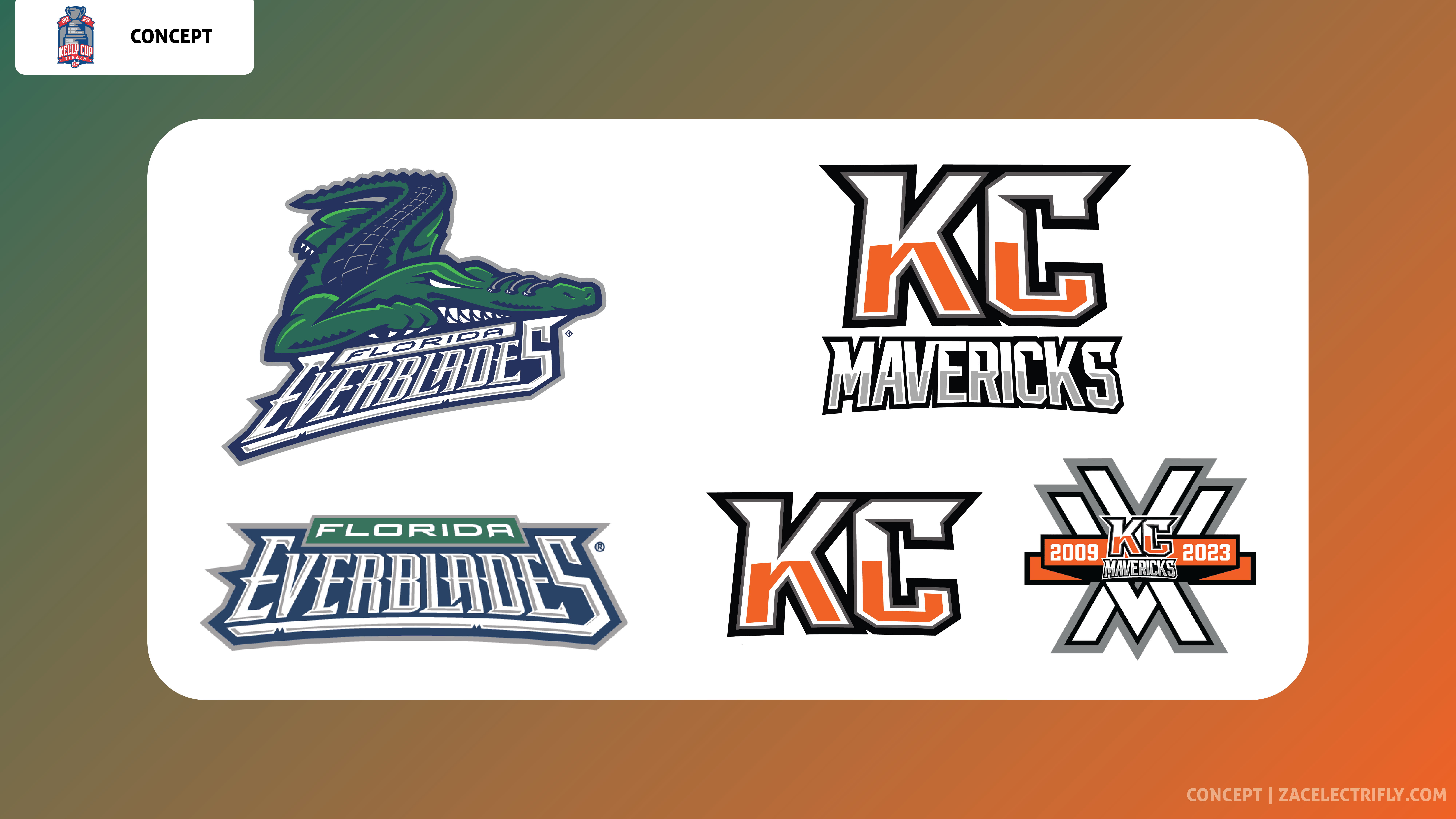 The Florida Everblades colors are green, blue, and grey. Their primary logo is an alligator with the team name below it. Their other logo I used for this concept is a wordmark logo. The Kansas City Mavericks colors are orange, grey, silver, and black. Their primary logo is a KC with “Mavericks” below it. Their secondary logo is the KC from their primary logo. This season they also had a fifteenth Anniversary logo. The anniversary logo is an interlocking XV with a banner that has “2009” and “2023” on it. The anniversary logo also has the primary logo on it.