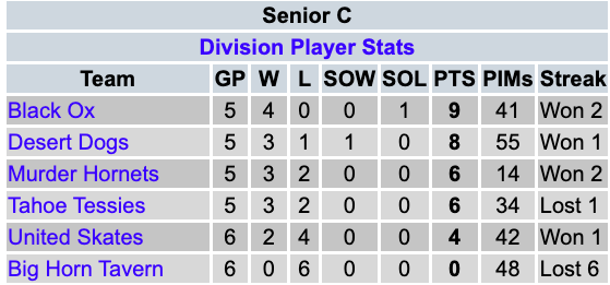 The Black Ox lead the C-League power rankings. Thy did not play in week seven. They are still the only team in the C-League undefeated during regulation. The Desert Dogs remain in second in the power rankings. They won their week two games. The Tahoe Tessies stayed in the third spot. They lost their week seven game to a top three team. The Murder Hornets stayed in the fourth spot. They did not play in week seven. The United Skates are fifth in the power rankings. They won their week seven game. Big Horn Tavern lost their week seven game. They remain the only team in the C-League without a win this season.