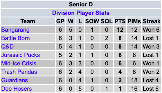 Bangarang still lead the D-League power rankings. They have won six games in a row to remain undefeated. Battle Born are in the second spot after a win and a loss in week seven. Q & D Construction are in the third spot. They did not play in week seven. Mid-Ice Crisis are in the fourth spot. They had a loss and a win in week seven. The Jurassic Pucks are in the fifth spot after not playing in week seven. The Trash Pandas moved up after a win. The Guardians moved down after a loss. The Reno Fire Hosers D stayed in the last spot. The Reno Fire Hosers D are the last team in the D-League to not win a game yet this season