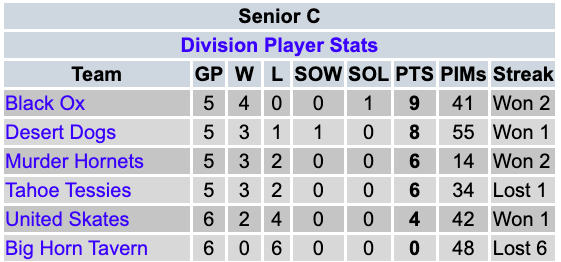 United Skates are the defending champions. Black Ox are three points from securing a playoff spot. They need a win and a game to go to a shootout in their last five games to secure a playoff spot. The Desert Dogs are four points away from securing a playoff spot. They need to win two of their last five games to secure a playoff spot. The Murder Hornets and Tahoe Tessies are six points away from securing a playoff spot. They need to win three of their last five games to secure a playoff spot. The United Skates are two points from tying for the last playoff spot. They need a win to tie for the last playoff spot and they need to win all four of their remaining games to secure a playoff spot. Big Horn Tavern are six points from tying for a playoff spot. They need to win three of their final four games to tie for the last playoff spot. Big Horn Tavern will not be able to secure twelve points but they still have a chance to advance to the playoffs.