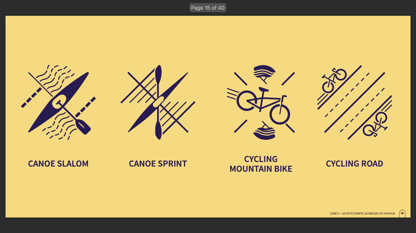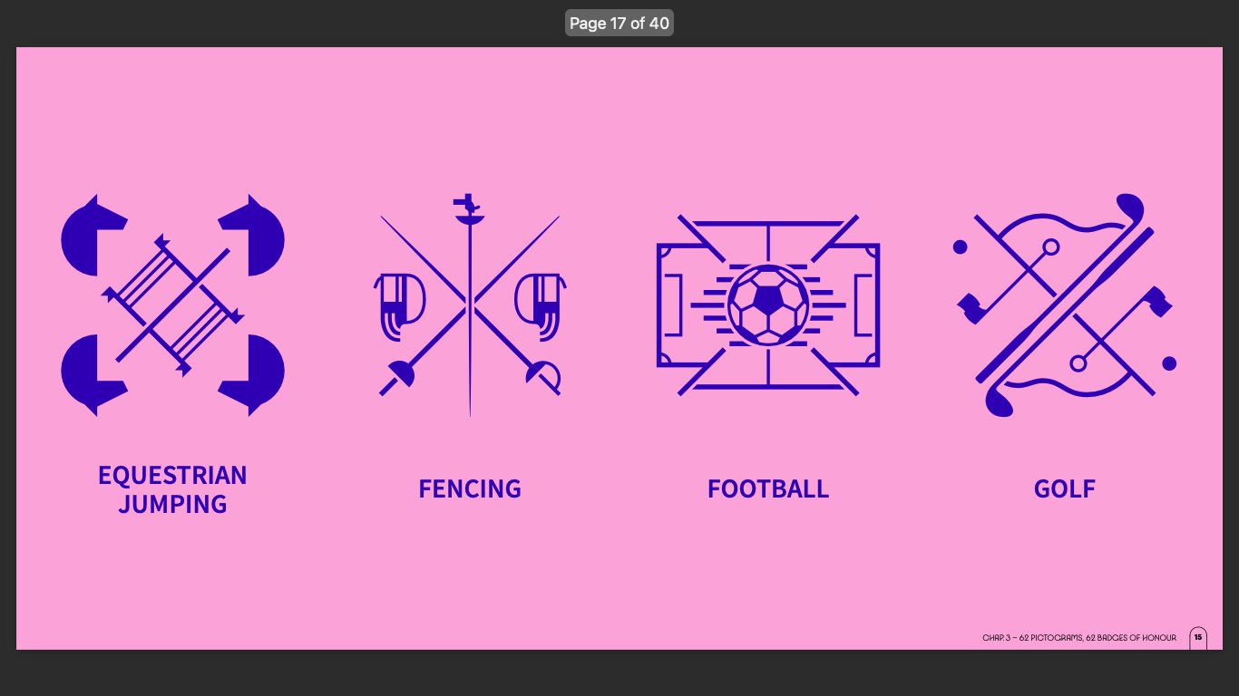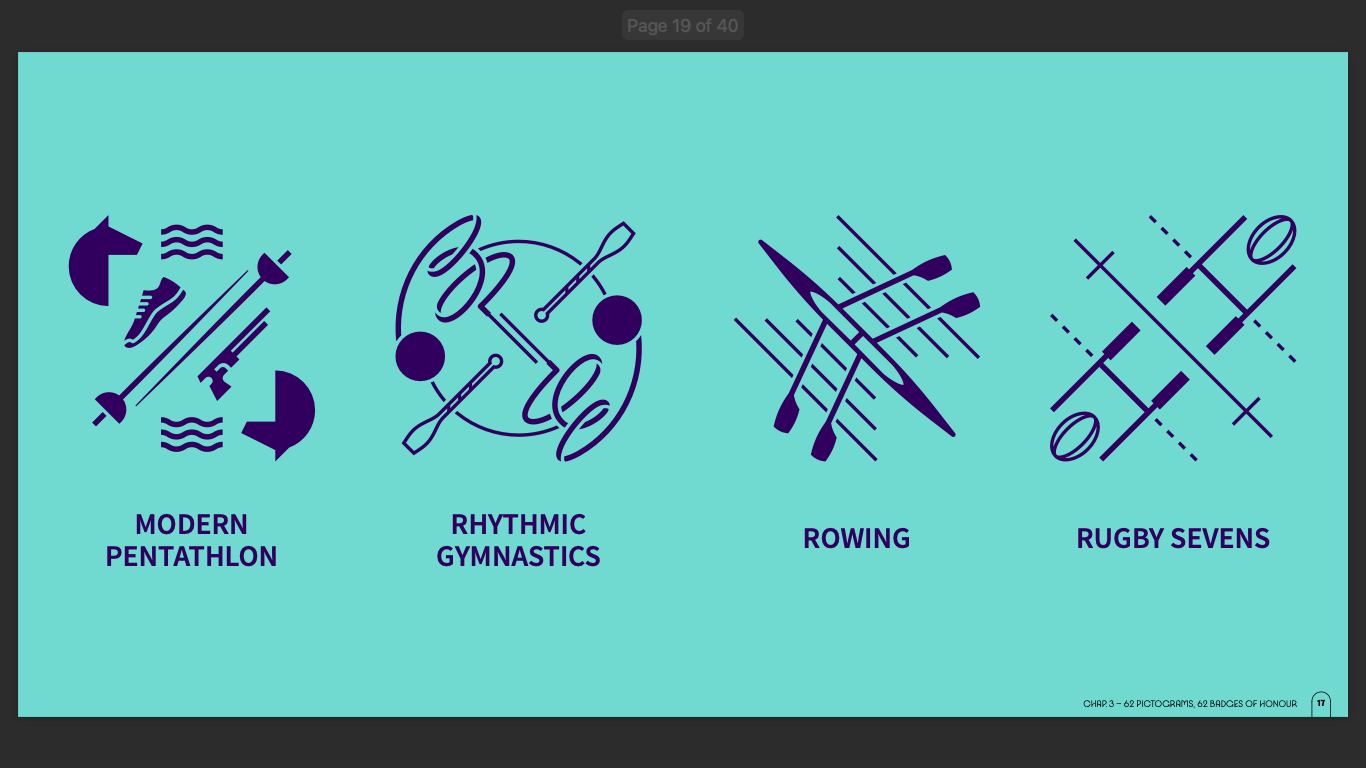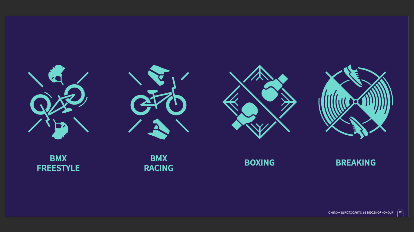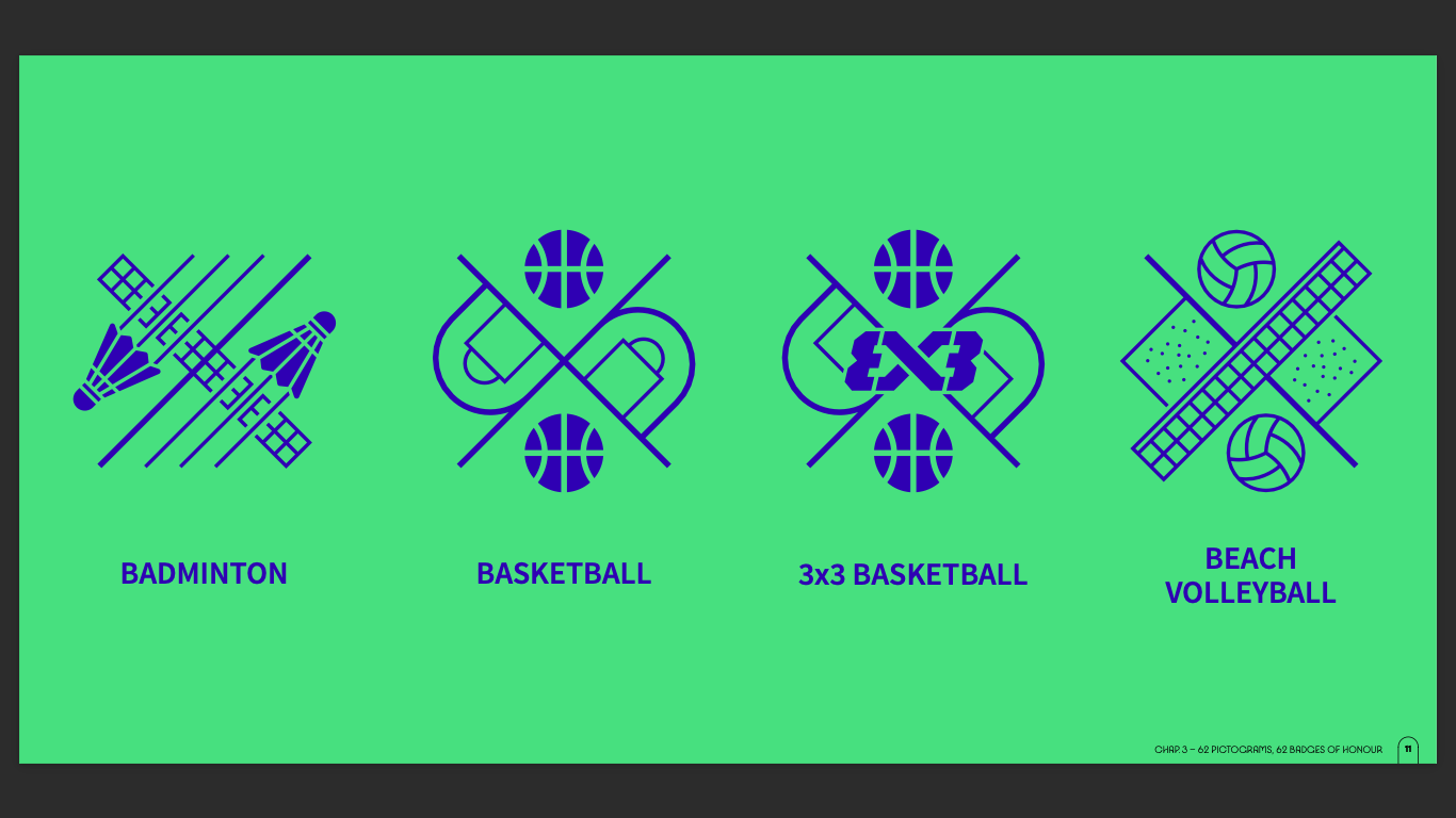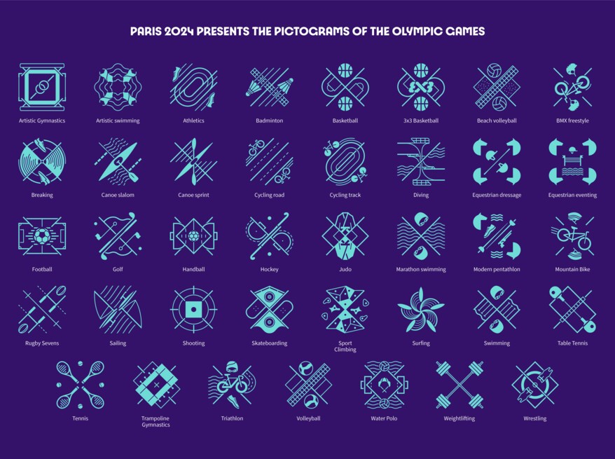 The Paris 2024 pictograms are unique. They are the first ones since 1968 to depict the sport rather than an athlete or multiple athletes playing the sport. Pictograms are important as they need to depict information without language. Having no athletes in any of the pictograms helps separate the events from each other visually. Unlike in previous Olympics they did not play around with the negative space or bounding of the pictograms. The Paris 2024 Pictograms are a departure from other parts of the branding by going for a less minimal look. This contrasts and complements the rest of the other branding elements such as patterns in a very cohesive way.