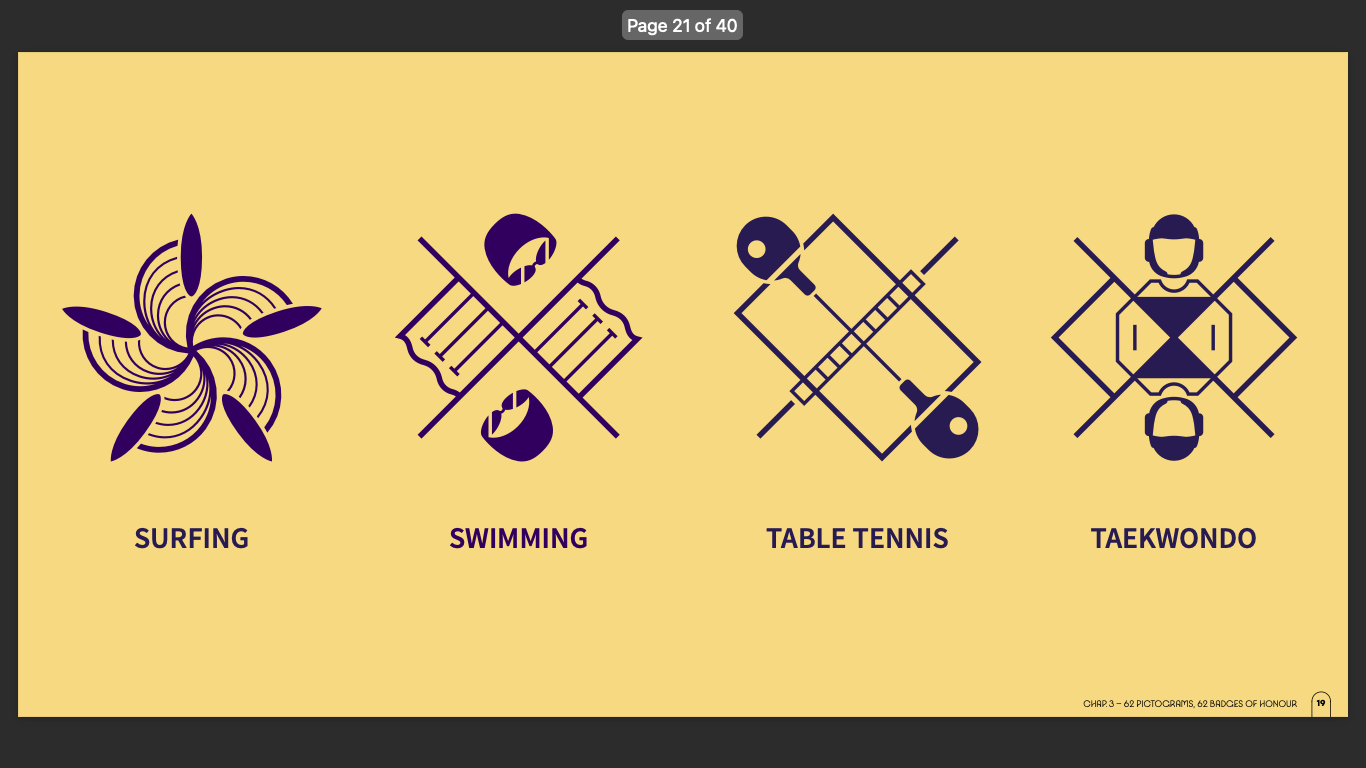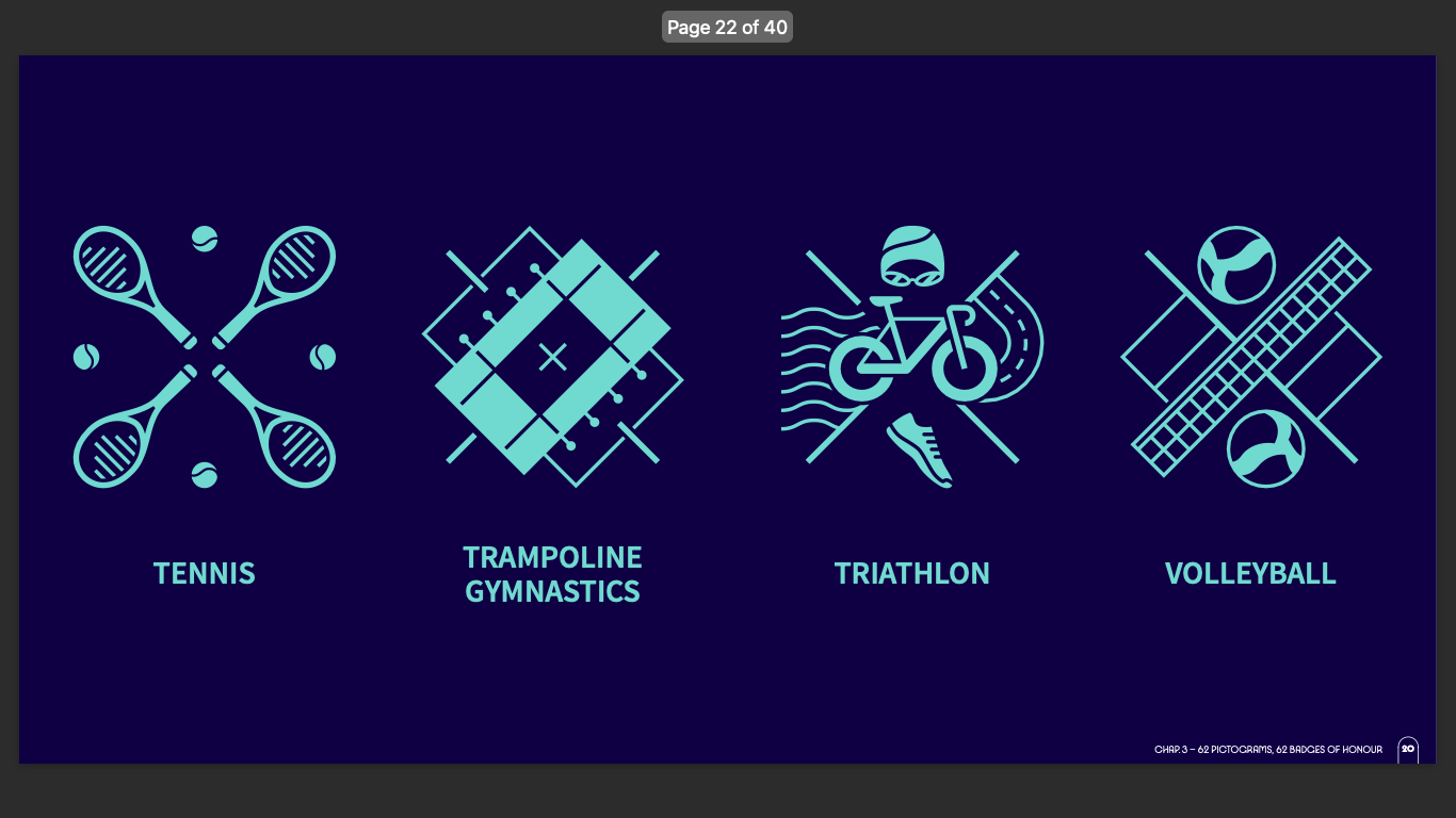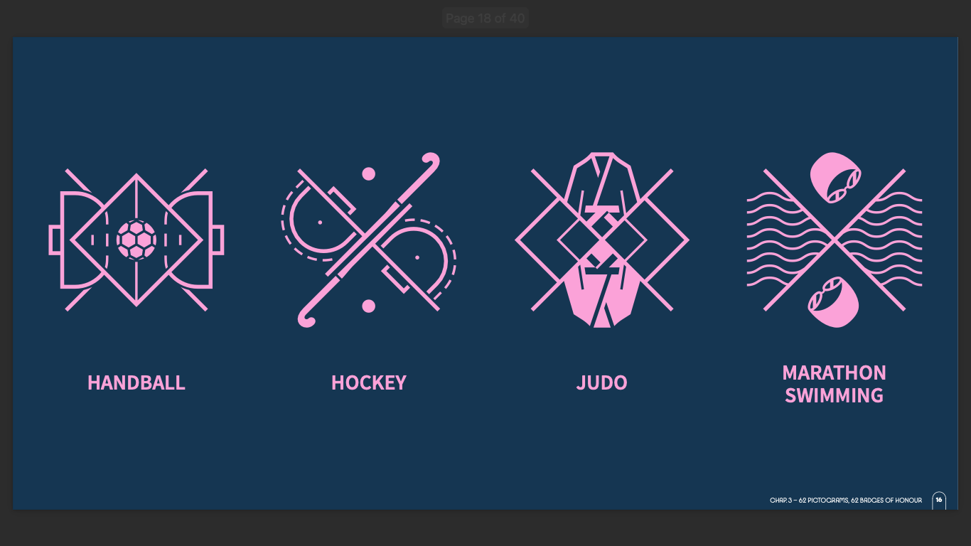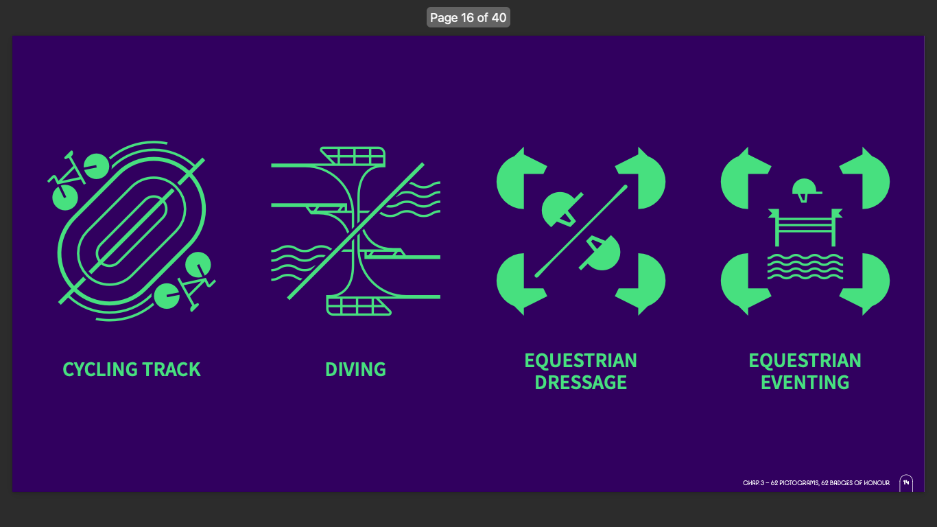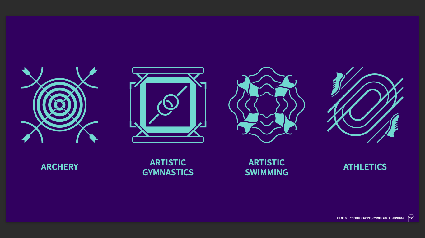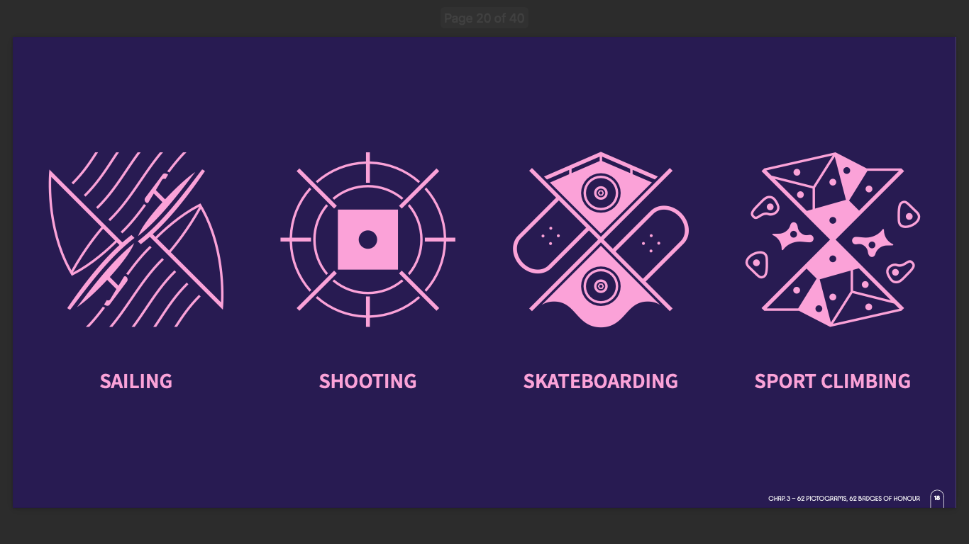 The Paris 2024 pictograms are unique. They are the first ones since 1968 to depict the sport rather than an athlete or multiple athletes playing the sport. Pictograms are important as they need to depict information without language. Having no athletes in any of the pictograms helps separate the events from each other visually. Unlike in previous Olympics they did not play around with the negative space or bounding of the pictograms. The Paris 2024 Pictograms are a departure from other parts of the branding by going for a less minimal look. This contrasts and complements the rest of the other branding elements such as patterns in a very cohesive way.