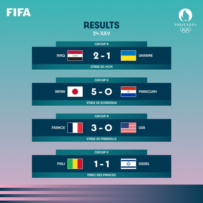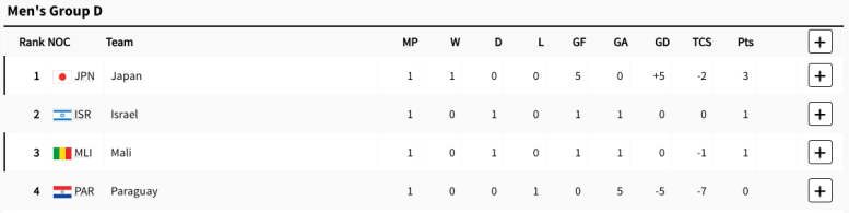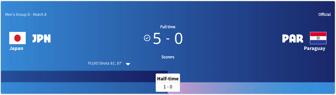 Japan obliterated Paraguay 5-0 in a men’s Group D match. Japan was only leading 1-0 at halftime. They kick it up a notch with four goals in the second half. Japan will play Mali next. Paraguay will play Israel.