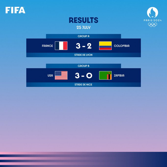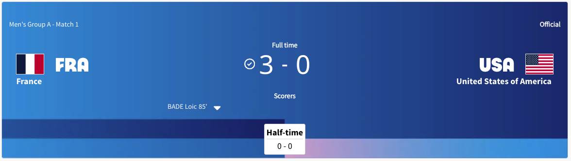 The United Stated were defeated by France 3-0 in their men’s Group A match. I did a full game review for this one. The United States made too many mistakes without being able to capitalize on their scoring chances. France will play Guinea next. The United States will play New Zealand next.