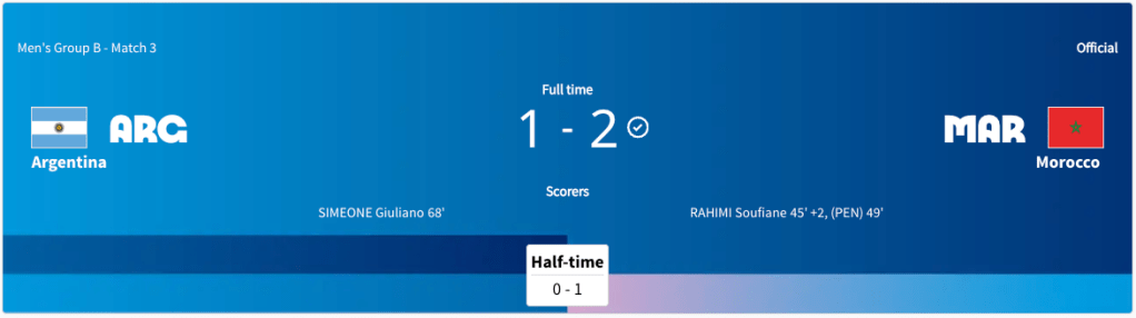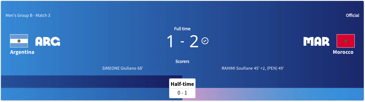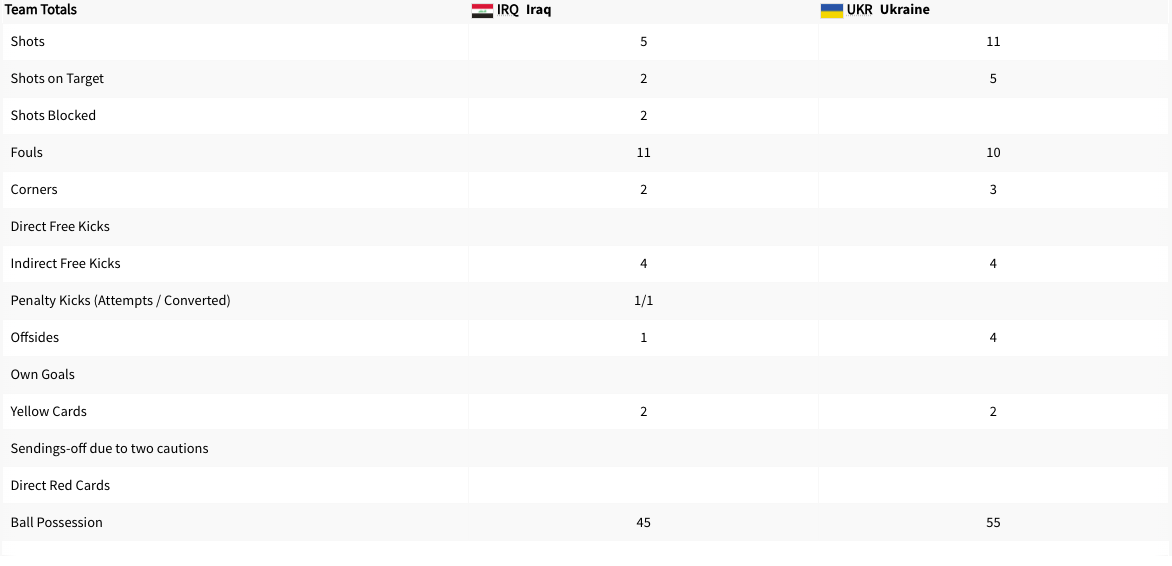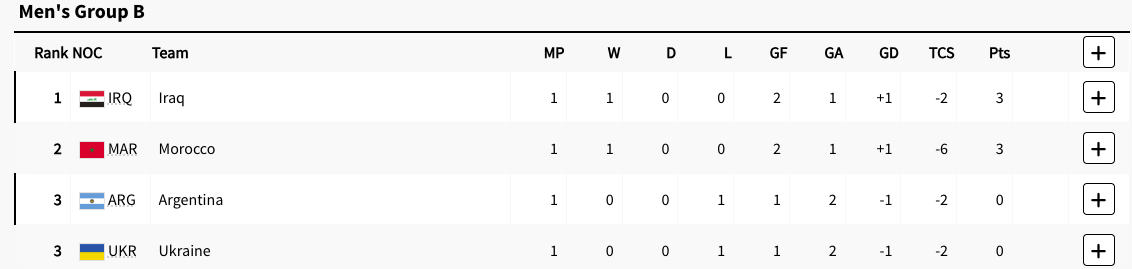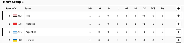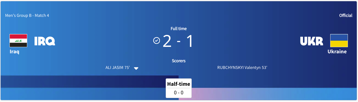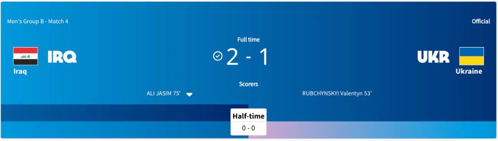 Iraq beat Ukraine 2-1 in a men’s Group B game. Ukraine took the lead in the 53′ minute. Iraq tied the game three minutes later. Iraq scored again in the 75′ minute to win the game. Iraq will play Argentina next. Ukraine will play Morocco next.