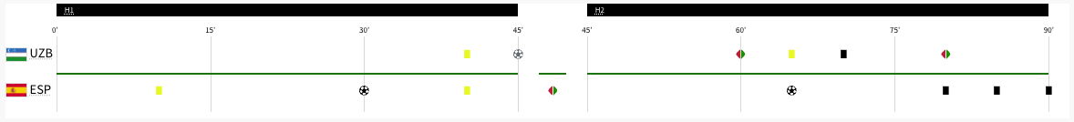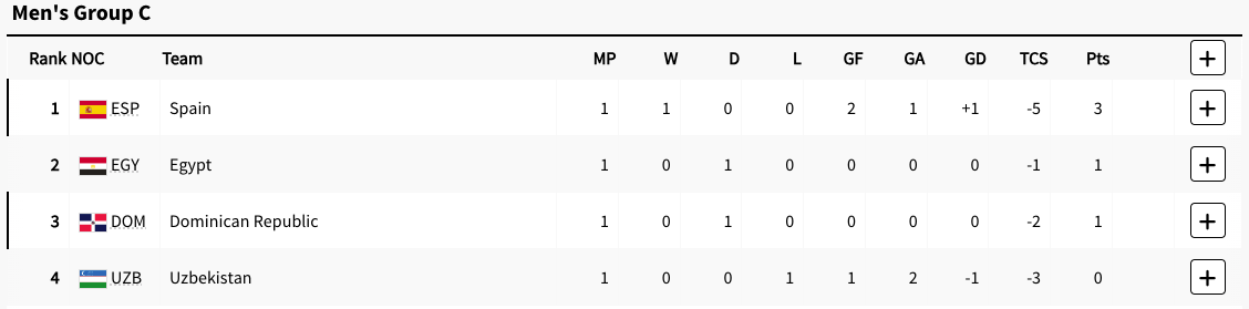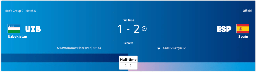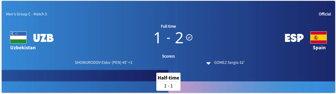 Uzbekistan lost 1-2 to Spain in a mens Group C match. Spain scored with Uzbekistan tying during stoppage time in the first half. Spain scored in the second half to win. Uzbekistan will play Egypt next. Spain will play the Dominican Republic next.