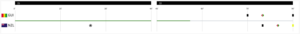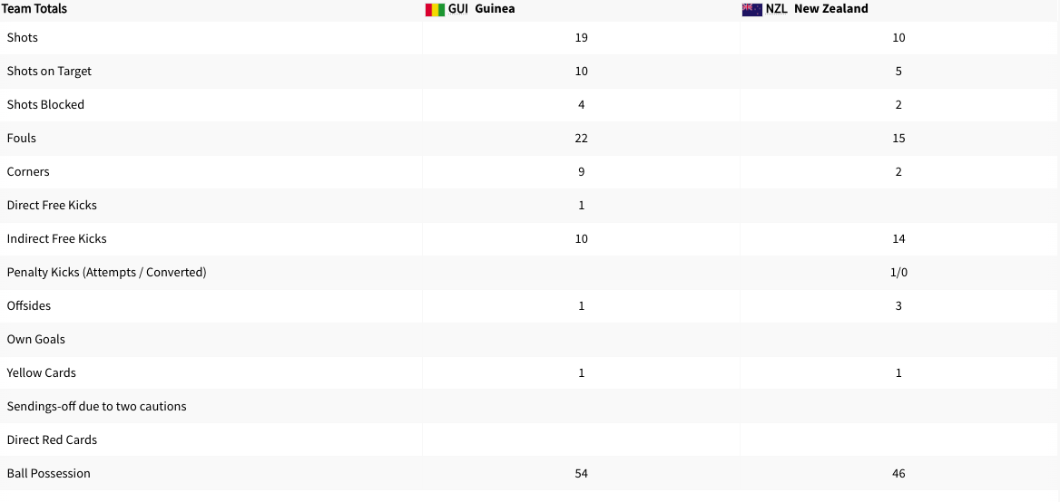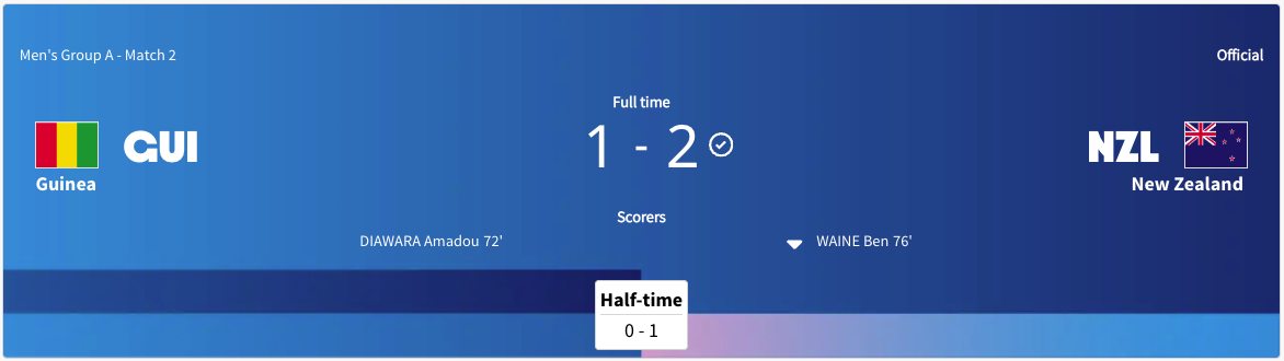 New Zealand beat Guinea 2-1 in a men’s Group A match. New Zealand had a 1-0 lead after the first half. Guinea tied the game in the 72′ minute. New Zealand scored the game winning goal in the 76′ minute. Guinea will play France next. New Zealand will play the United States next.