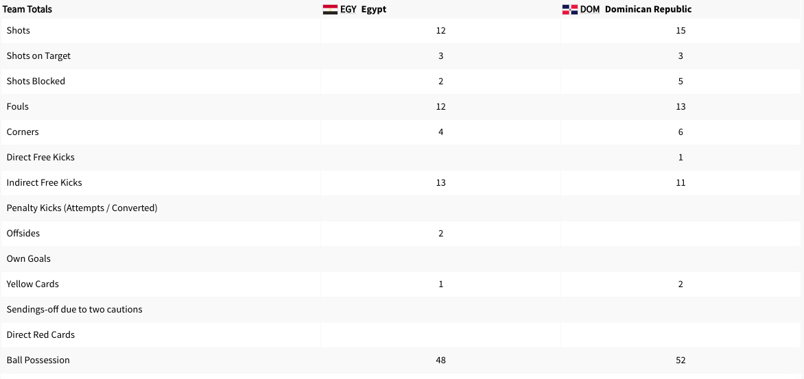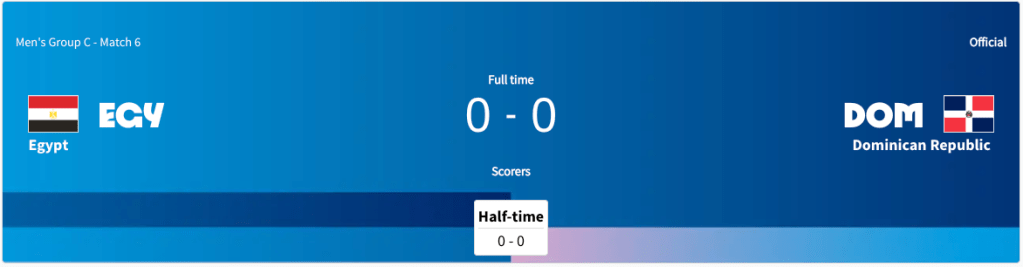 Egypt and the Dominican Republic ended their men’s Group C match in a 0-0 draw. Neither team scored. Egypt will play Uzbekistan next. The Dominican Republic will play Spain next.