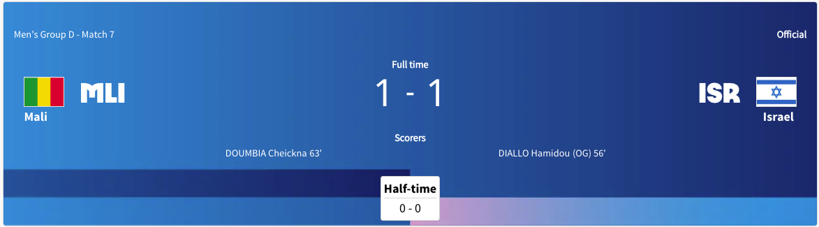 Mali and Israel finished their men’s Group D match in a 1-1 draw. Mali scored an own goal in the second half. They scored on Israel within ten minutes to tie the game. Neither team did well in this one. Mali will play Japan next. Israel will play Paraguay next.