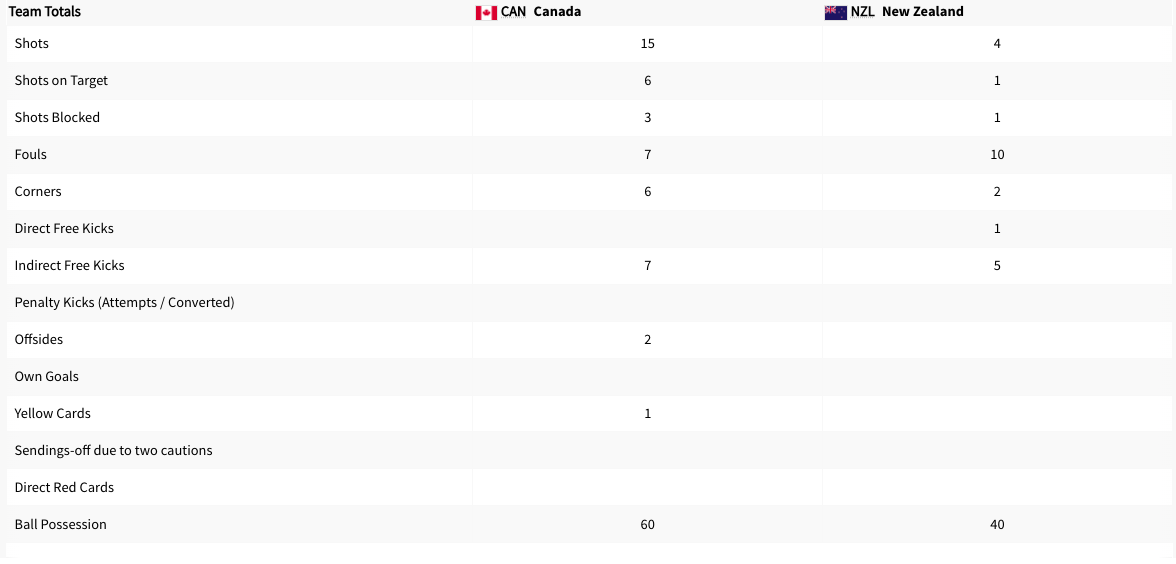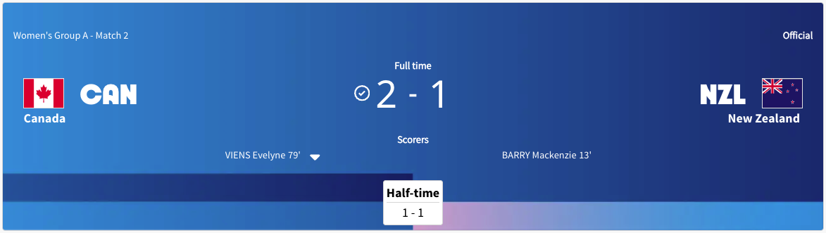 Canada played New Zealand. It was a women’s Group A match. New Zealand took the lead in the 13′ minute. Canada tied the game right at halftime. Canada took the lead in the 79′ minute. The final score was 2-1 Canada. Canada play France next. New Zealand play Colombia next.