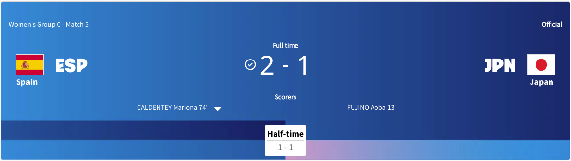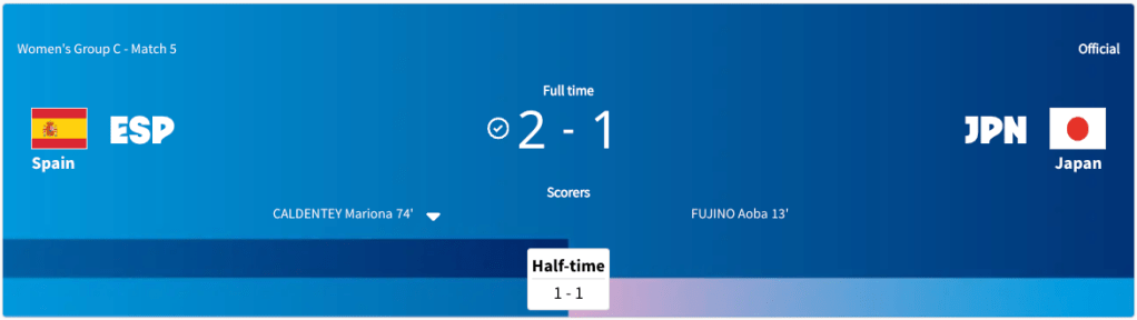 Spain played Japan. I was a women’s Group C match. Japan took the lead in the 13′ minute. Spain tied the game in the 22′ minute. Spain took the lead in the 74′ minute. The final score was 2-1 Spain. Spain will play Nigeria in their next match. Japan will play Brazil in their next match.