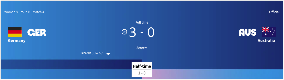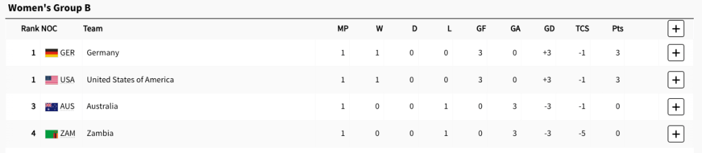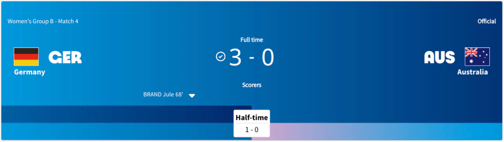Germany took on Australia. It was a women’s Group B match. Germany took the lead in the 24′ minute. Germany added to their lead in the 64′ minute. Germany scored again in the 68′ minute. The final score was 3-0 Germany. Germany will face the United States next. Australia will play Zambia next.