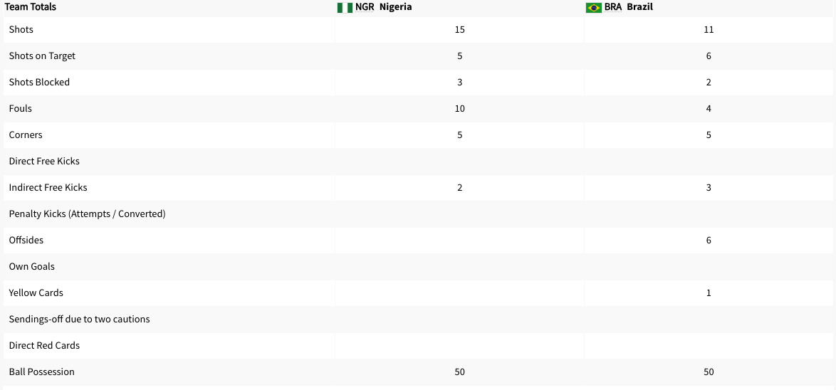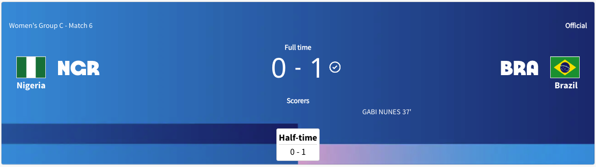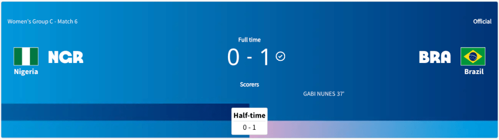 Nigeria played Brazil. It was a women’s Group C match. Brazil took the lead in the 37′ minute. Neither team scored in the second half. The final score was 1-0 Brazil. Nigeria will play Spain next. Brazil will play Japan next.