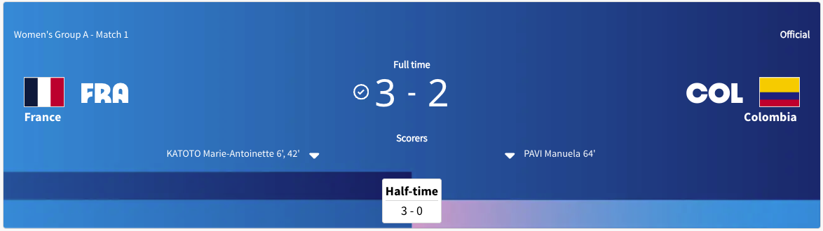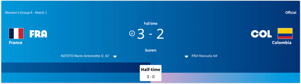 France played Colombia. It was a Women’s Group A match. France took the lead in the 6′ minute. France scored again in the 18′ minute. France scored again in the 42′ minute. Colombia scored in the 54′ minute. Colombia scored again in the 64′ minute. Colombia got a red card in the 85′ minute. The final score was 3-2 France. France will play Canada next. Colombia will take on New Zealand next.