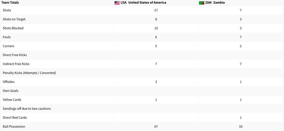The United States played Zambia. I did a full review for this game you can check out. The United States took the lead in the 17′ minute. The United States scored their second goal in the 24′ minute. The United States scored their third goal in the 25′ minute. Zambia received a yellow card in the 30′ minute. Neither team scored in the second half. The United States will play Germany next. Zambia will play Australia next.