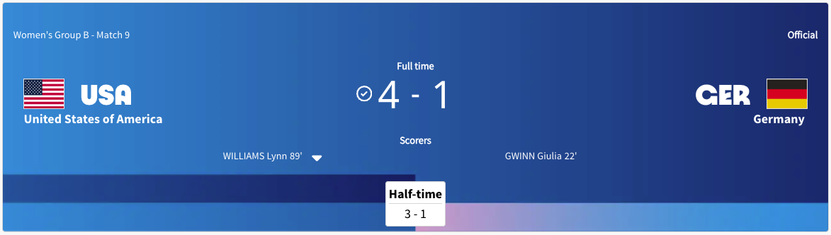 I thought this game would be a lot closer. Germany just collapsed. They could not keep up with the pace set by the United States. The United States looks really good right now. They are in a form that a lot of people have said they have not seen in years. To some extent I have to agree with that. They are looking a lot better than they did at the FIFA Women’s World Cup in 2023 or Tokyo 2020. This team is fun and exciting to watch. I can’t wait for what they do next.