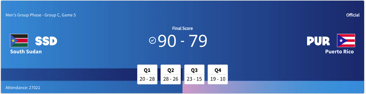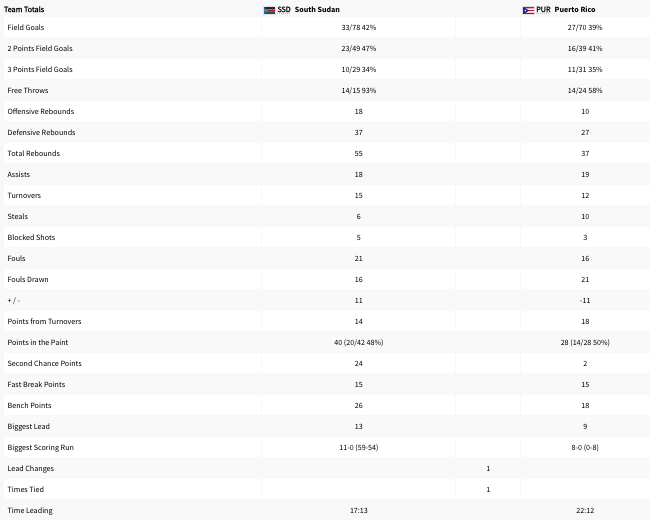 South Sudan played Puerto Rico in a men’s Group A game. Puerto Rico was leading 20-28 after the first quarter. Puerto Rico was leading 54-48 at halftime. South Sudan was leading 71-69 going into the fourth quarter. South Sudan won the game 90-79. South Sudan had a strong come from behind win. They were able to shut down Puerto Rico in the fourth quarter which set them up for the win. South Sudan will play the United States next. Puerto Rico will play Serbia next.
