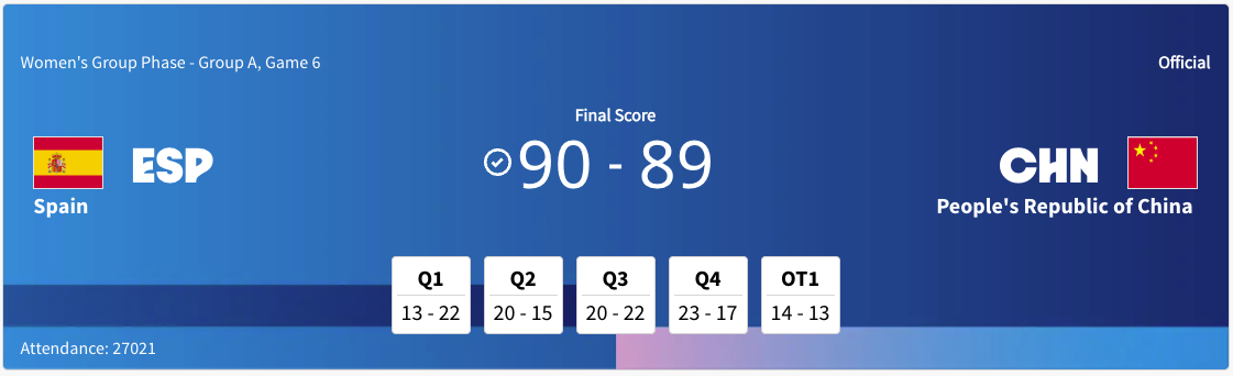 Spain played China. This was a women’s Group A match. China had a 22-13 lead after the first quarter. China had a had a 37-33 lead at halftime. China had a 59-53 lead going into the final quarter. The score was tied at 76-76 after the fourth quarter. Spain won the game 90-89 in overtime. Spain fought their way back in this one. China was inconsistent with their offensive play. Spain will play Puerto Rico next. China will play Serbia next.