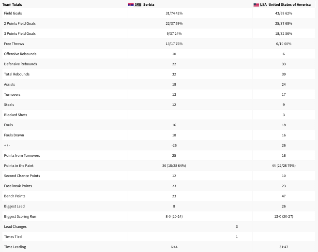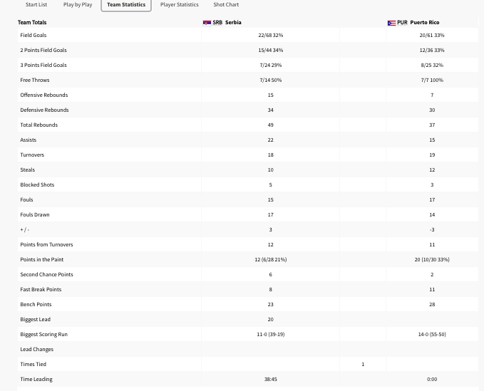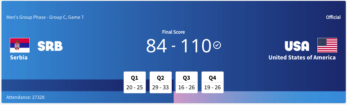 Serbia played the United States. I did a game preview and review for this one. It was a men’s Group C match. The United States led the game 25-20 after the first quarter. The United states were leading 58-49 at halftime. The United States were leading 84-65 heading into the fourth quarter. The United States won the game 110-84. Strong win for the United States. They are the first team to break 100 points in a single game so far in this tournament. Serbia will play Puerto Rico next. The United States will play South Sudan next.