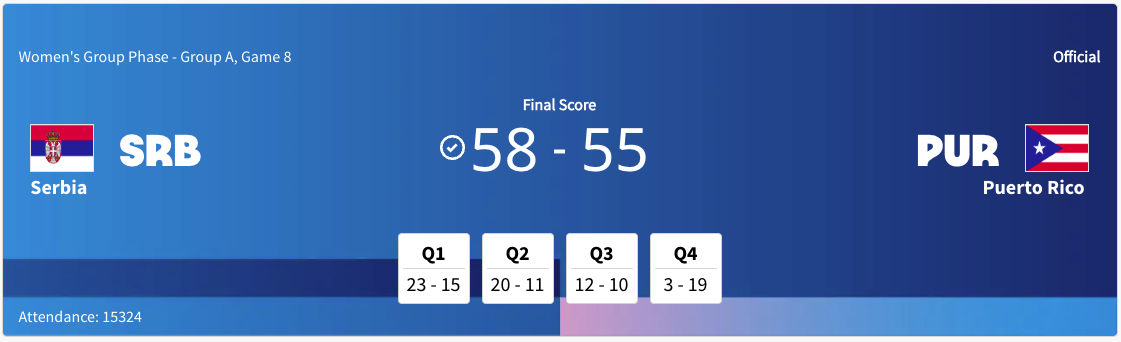 Serbia played Puerto Rico. This was a women’s Group A game. Serbia had a 23-15 after the first quarter. Serbia had a 43-26 lead at halftime. Canada was leading 55-36 going into the fourth quarter. Serbia won the game 58-55. Puerto Rico had a huge come back in the fourth quarter. They held Serbia to just three points in the fourth quarter. Those three points would end up being the game winning points. Serbia play China next. Puerto Rico play Spain next.
