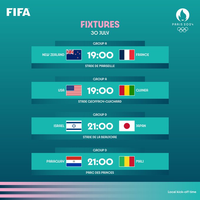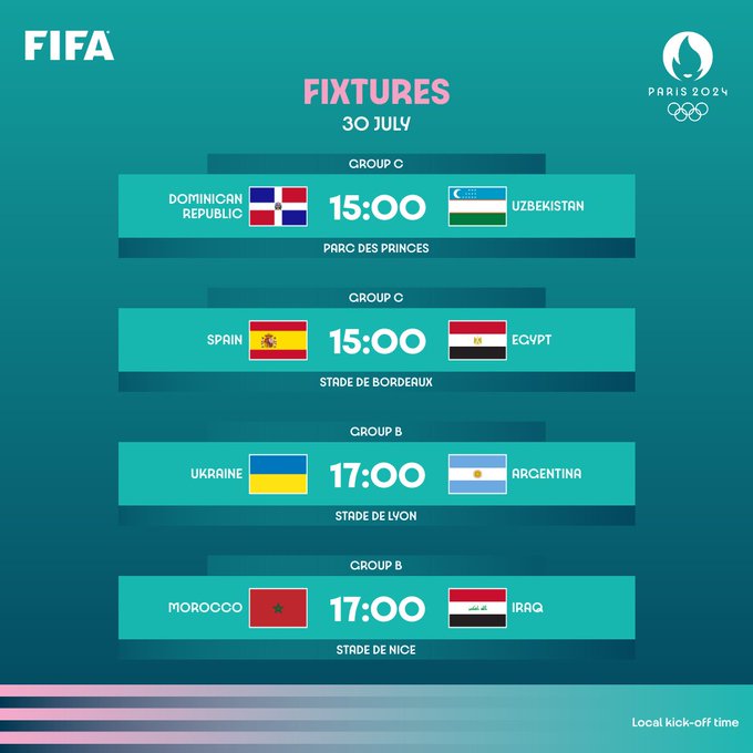 Soccer at the Games of the XXXIII Olympiad continued on Tuesday. There were eight matches. All of the matches were for the men’s tournament. There were no matches on Monday. Tuesday was the final day of the group stage of the men’s tournament. The Dominican Republic played Uzbekistan. Spain played Egypt. Ukraine played Argentina. Morocco played Iraq. New Zealand played France. The United States played Guinea. Israel played Japan. Paraguay played Mali. Soccer at Paris 2024 continues tomorrow with six games.
