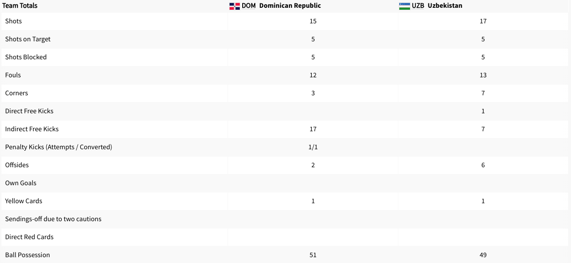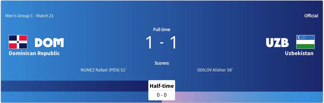 The Dominican Republic played Uzbekistan. It was a Group C match. This match was taking place while Spain played Egypt. Uzbekistan got a yellow card in the 25′ minute. The score was 0-0 at halftime. The Dominican Republic scored in the 51′ minute on a penalty. The Dominican Republic got a yellow card in the 54′ minute. Uzbekistan tied the game in the 58′ minute. The game ended in a 1-1 draw. That is the end of Paris 2024 for both teams. Both teams failed to advance to the knockout stage.