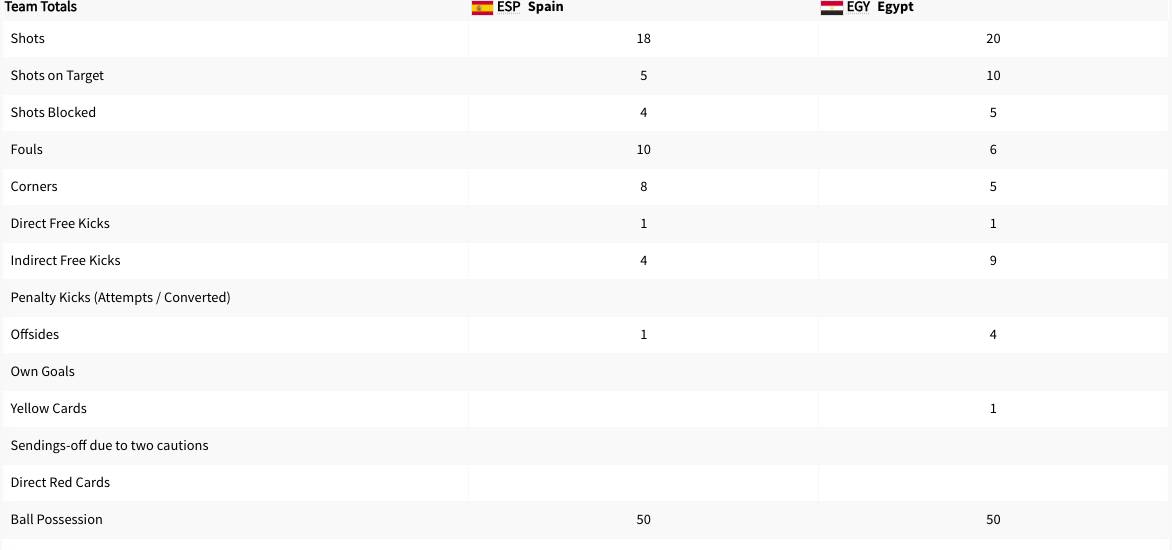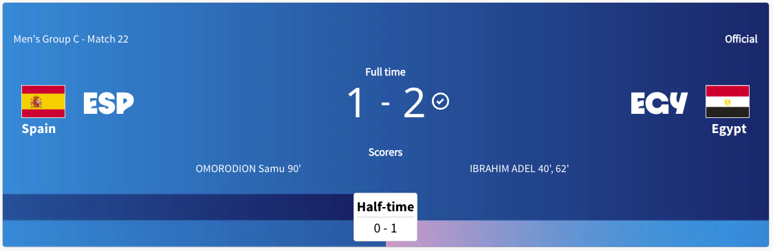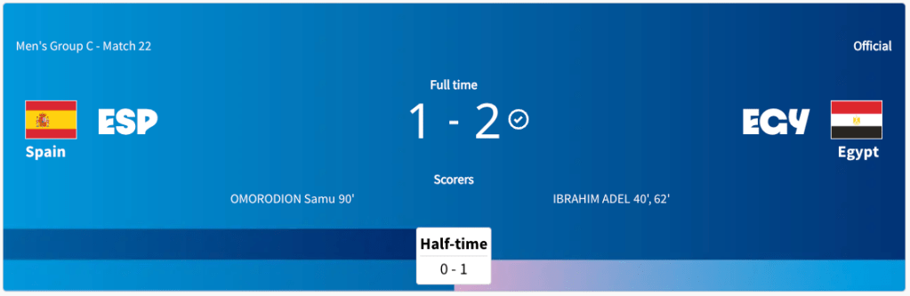 Egypt played Spain. It was a Group C match. This match took place while the Dominican Republic played Uzbekistan. Egypt got a yellow card in the 6′ minute. Egypt took the lead in the 40′ minute. The Score was 1-0 Egypt at halftime. Egypt took a two goal lead in the 62′ minute. Spain scored in the 90′ minute. The final score was 2-1 Egypt. Egypt will play Paraguay next. Spain will play Japan next.