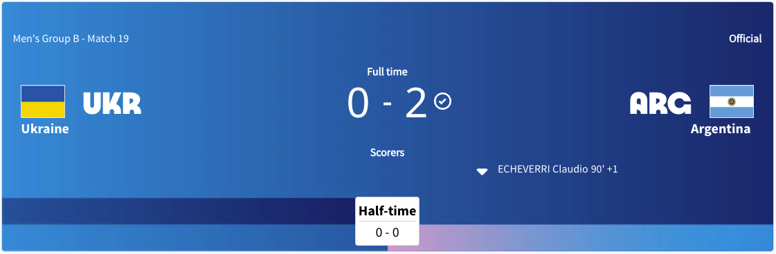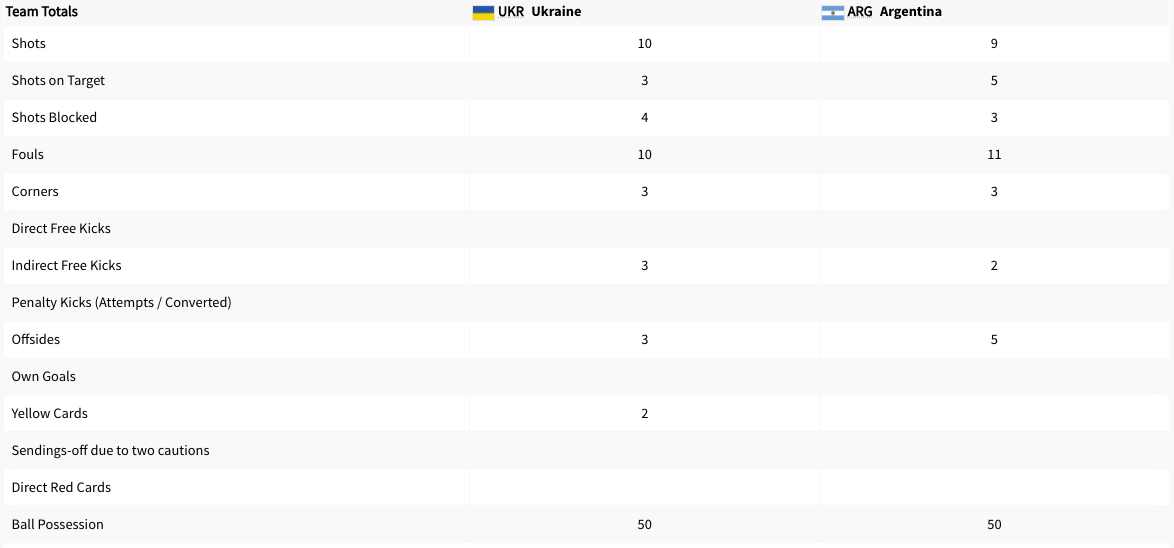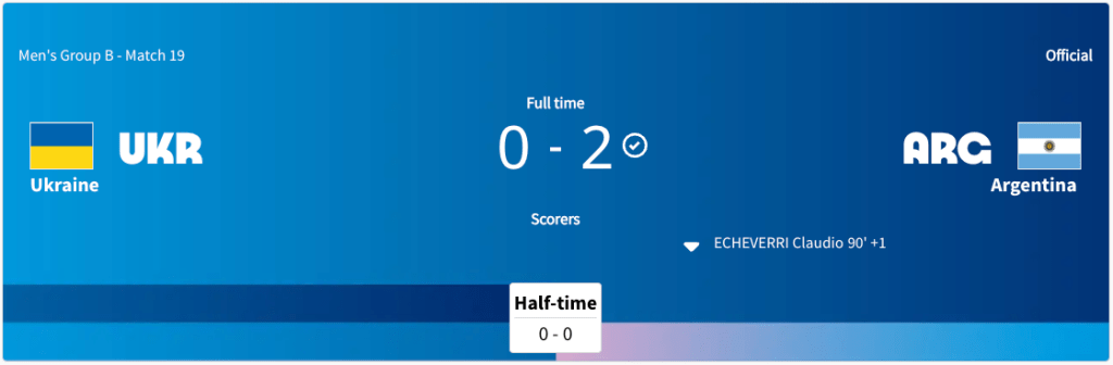 Ukraine played Argentina. This was a Group B match. This match was played at the same time Morocco was playing Iraq. The score was tied up at 0-0 after the first half. Argentina took the lead in the 47′ minute. Ukraine got a yellow card in the 53′ minute. Ukraine got another yellow card int he 82′ minute. Argentina scored again in extra time. The final score was 2-0 Argentina. Ukraine did not advance to the knockout stage. Argentina will play France next.