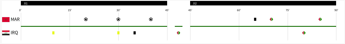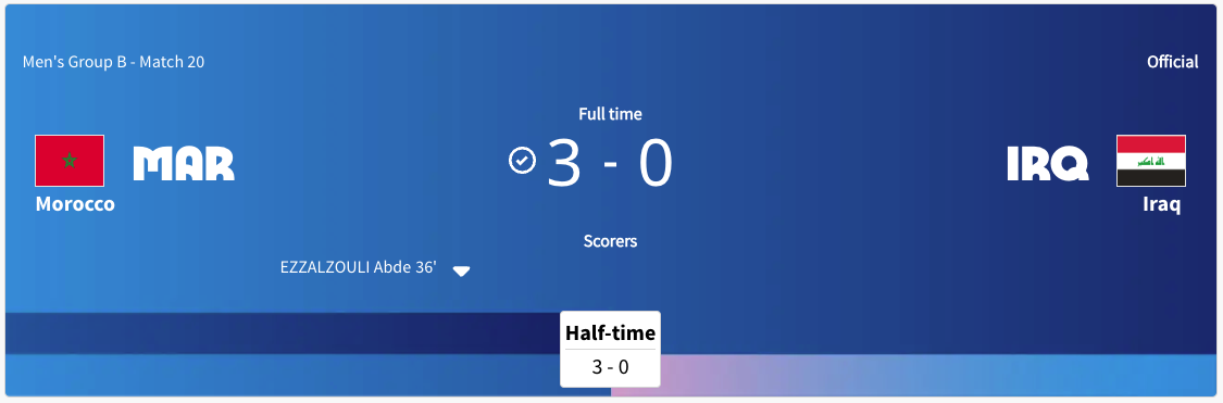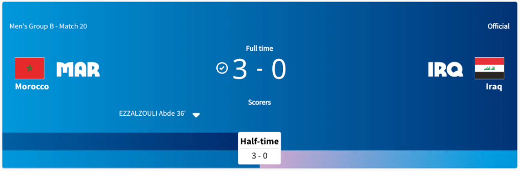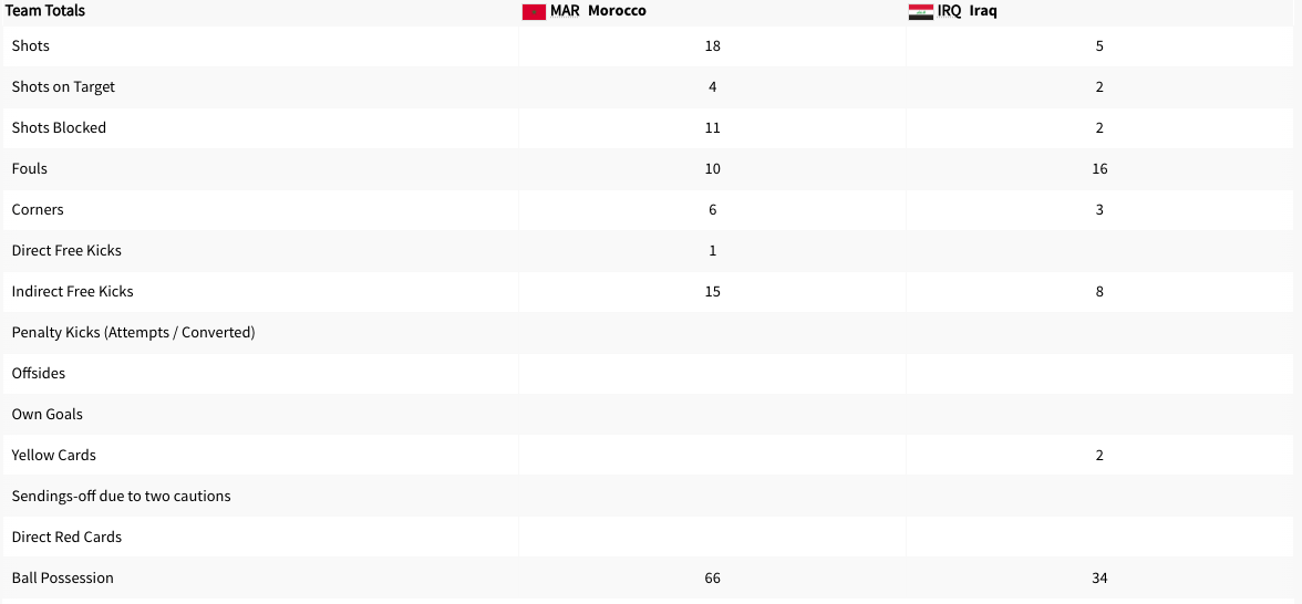 Morocco played Iraq. It was a Group B match. This game was played at the same time Ukraine was playing Argentina. Iraq got a yellow card in the 9′ minute. Morocco took the lead in the 19′ minute. Morocco took a two goal lead in the 28′ minute. Morocco took a three goal lead in the 36′ minute. The score was 3-0 at halftime. Neither team scored in the second half. The final score was 3-0 Morocco. Morocco will play the United States next. Iraq did not advance to the knockout stage.