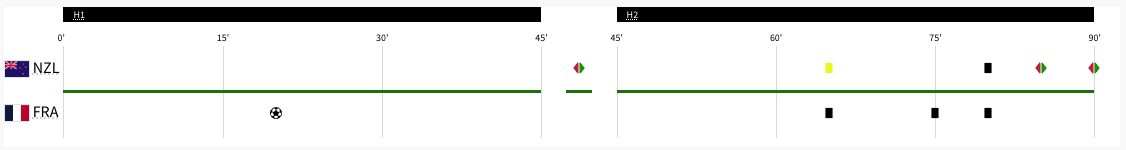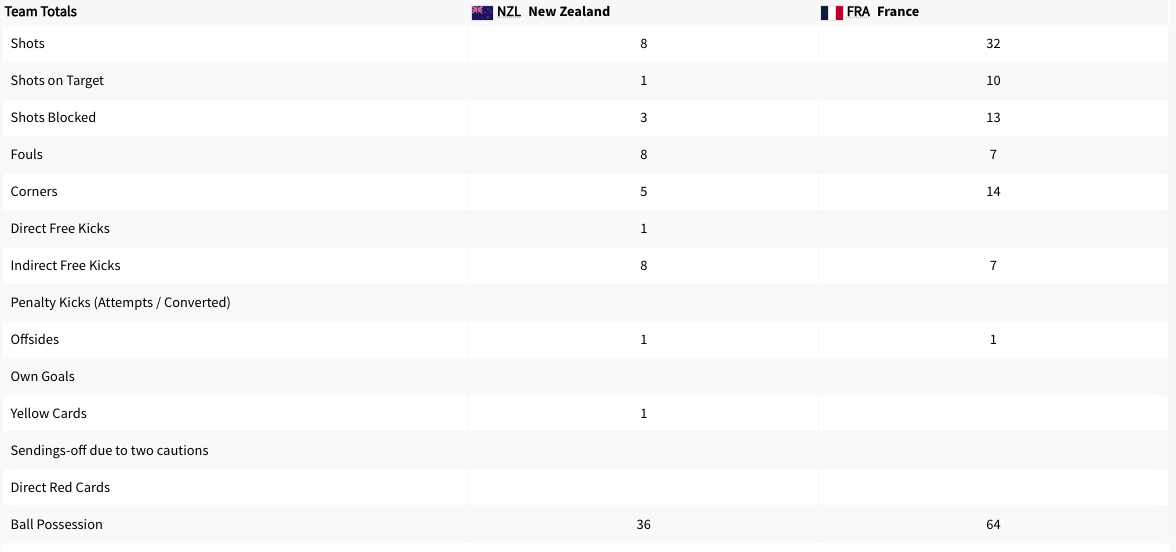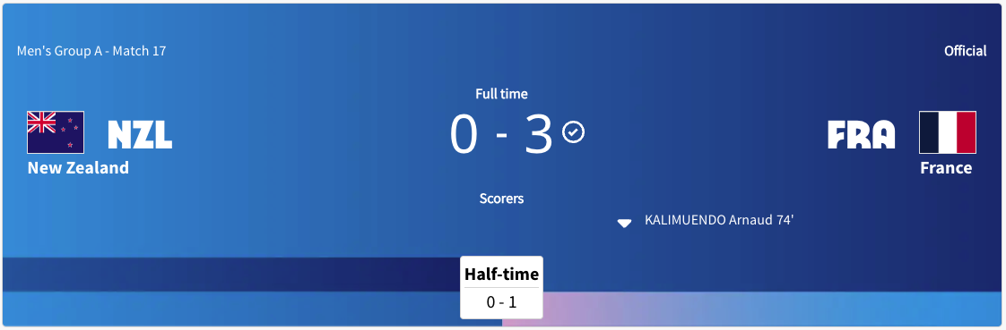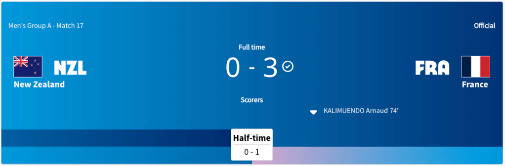 New Zealand played France. This was a Group A match. This was played at the time the United states played Guinea. France took the lead in the 19′ minute. The score was 1-0 at halftime. New Zealand got a yellow card in the 63′ minute. France scored again int he 71′ minute. France took a three goal lead in the 74′ minute. The Final score was 3-0 France. New Zealand did not advance to the knockout stage. France will play Argentina next.