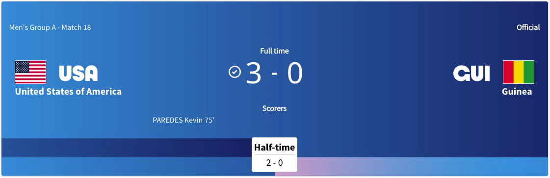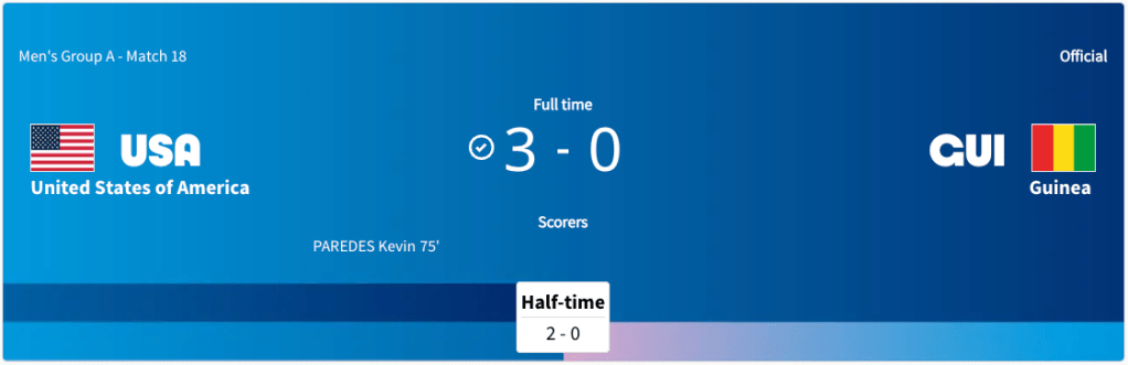 This is the first time the host nation France have advanced in the men’s Olympic tournament since Atlanta 1996. France were eliminated in the stage at Tokyo 2020. This is the first time that the United States have advanced to the knockout stage at the Olympics since Sydney 2000. The United States did not qualify for Tokyo 2020. New Zealand advanced past the group stage at Tokyo 2020 but has been eliminated in the group stage in Paris 2024. This was the first appearance for Guinea in this tournament. Being eliminated in the group stage is the best they have ever done. This is only the second time Morocco have made it to the knockout stage in this tournament. The last time they made it out of the group stage was at Munich 1972. This is the first time since Beijing 2008 that Argentina have advance to the knockout stage in this tournament. Argentina won back to back gold medals at Athens 2004 and Beijing 2008. This is Ukraines first appearance at this tournament. Being eliminated in the group stage is the best they have ever done. The last time that Iraq made it out of the group stage was Athens 2004. They got their highest ever result at that games coming in fourth place. The last time Egypt made it out of the group stage was at Tokyo 2020. That is back to back knockout round appearances for them. The last time Spain made it out of the group stage was at Tokyo 202 where they won the silver medal. This is the first Olympic men’s tournament for the Dominican Republic. Being eliminated in the group stage was their best ever result. This was also the first ever tournament for Uzbekistan. Being eliminated in the group stage was also their best result ever. The last time Japan made it out of the group stage was at Tokyo 2020 where as hosts they got fourth place. The last time Paraguay advanced to the knockout stage was at Athens 2004 where they won a silver medal. The only time Mali advanced to the knockout stage was at Athens 2004. Paris 2024 was only the second Olympics they qualified for. Israel has not advanced to the knockout stage since Montreal 1967. This was the first Olympic men’s soccer tournament they qualified for since Montreal 1976.