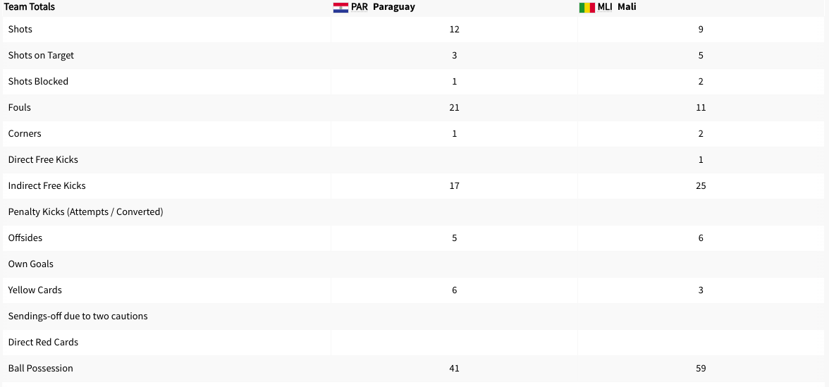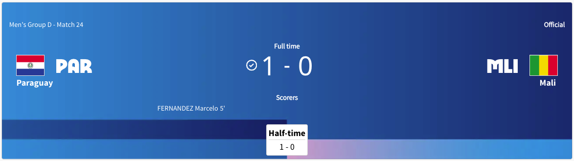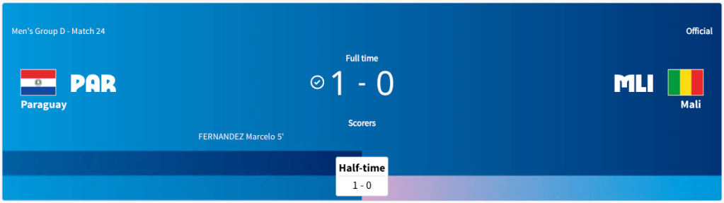 Paraguay played Mali. This was a Group D match. It was played at the same time Israel was playing Japan. Paraguay took the lead in the 5′ minute. Paraguay got a yellow card in the 38′ minute. Paraguay got another yellow card in extra time of the first half. The score was 1-0 Paraguay after the first half. Paraguay got another yellow card in the 58′ minute. Paraguay got yet another yellow card in the 71′ minute. Paraguay got two more yellow cards in extra time. Mali got three yellow cards in extra time. The final score was 1-0 Paraguay. Paraguay will play Egypt next. Mali did not advance to the knockout stage.