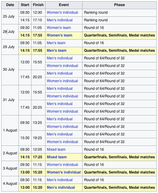 Archery at the Games of the XXXIII Olympiad continued Wednesday. The individual rounds continued on Wednesday. Both the men’s and women’s individual competitions continued. Tuesday, Wednesday, and Thursday are the round of 64 and round of 32 for the individual events. Like with the team events it is a best of five sets. Each archer shoots three arrows per set. Some of todays event had to be postponed due to weather. Postponed matches are scheduled for Thursday.