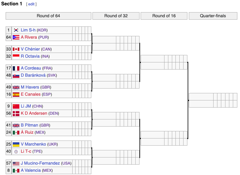 In the women’s event, the rest of section four and some section one had matches. In section four during the round of 64, the twenty three seed Deepika Kumari of India beat the forty two seed Reena Pärnat of Estonia. Their match went to a shoot off where Reena Pärnat shot an 8 and Deepika Kumari shot a 9. The fifty five seed Quinty Roeffen of the Netherlands upset the ten seed Elisabeth Straka of Austria three sets to two. The fifteen seed Chiara Rebagliati of Italy beat the fifty seed Ariana Zairi of Malaysia in a shoot off. Ariana Zairi shot a nine. Chiara Rebagliati shot a ten. The forty seven seed Mădălina Amăistroaie of Romania upset the eighteen seed Mikaella Moshe of Israel. Mădălina Amăistroaie won three sets and they tied one set. The Thirty one seed Marie Horáčková of the Czach Republic beat the the thirty one seed Ziyodakhon Abdusattorova of Uzbekistan three sets to one. The number two seed Nam Su-hyeon of South Korea beat the sixty three seed Jana Ali of Egypt. They tied one set and Nam Su-hyeon won three sets.