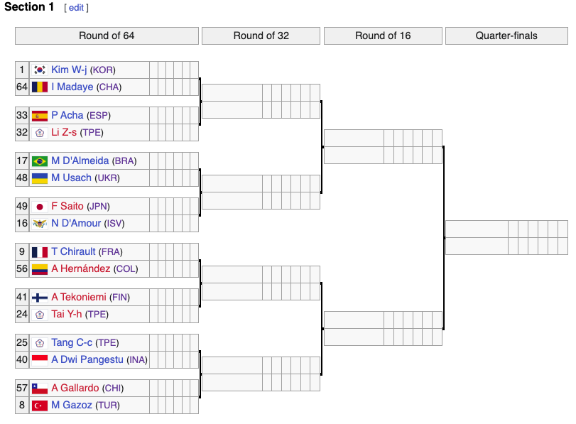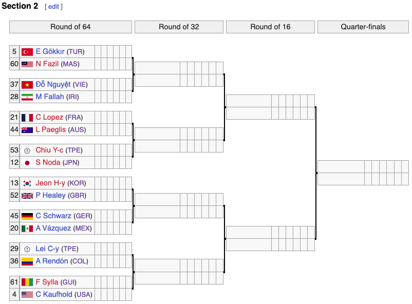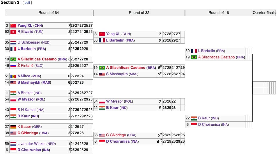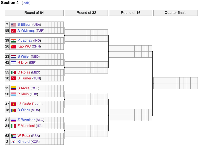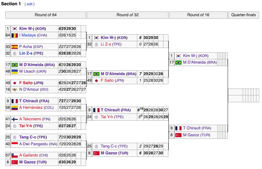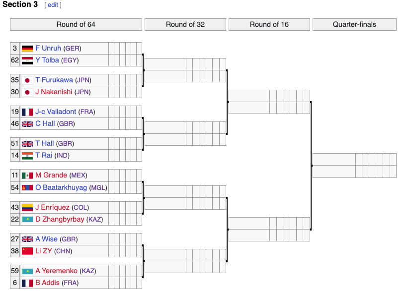 In section three during the round of 64, the forty six seed Conor Hall of Great Britain. upset the nineteen seed Jean-Charles Valladont of France. Conor Hall won two sets, they tied two sets, and Jean-Charles Valladont only won one set. The fifty one seed Tom Hall of Great Britain upset the fourteen seed Tarundeep Rai of India. Yom Hall won two sets, they tied two sets and Tarundeep Rai won one set.
