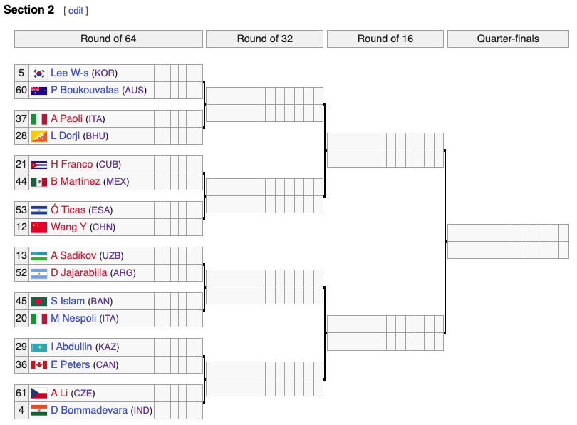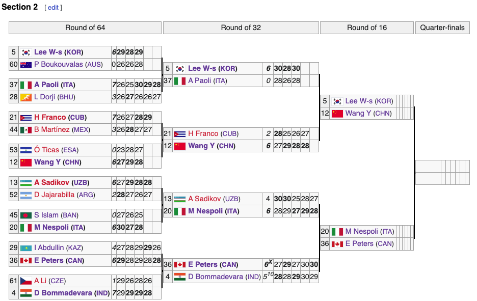 In the men’s event, the rest of the section two bracket and part of the section three bracket had matches. In section two during the round of 64, the five seed Lee Woo-seok of south Korea swept the sixty seed Peter Boukouvalas of Australia three sets to zero. The thirty seven seed Alessandro Paoli of Italy beat the twenty eight seed Lam Dorji of Bhutan three sets to one after tying the first set. The twenty one seed. Hugo Franco of Cuba beat the forty four seed Bruno Martínez of Mexico two sets to one after tying the first set. The twelve seed Wang Yan of China swept the fifty three seed Óscar Ticas of El Salvador three sets to zero. The thirteen seed Amirkhon Sadikov of Uzbekistan beat the fifty two seed Damián Jajarabilla of Argentina three sets to one. The twenty seed Mauro Nespoli