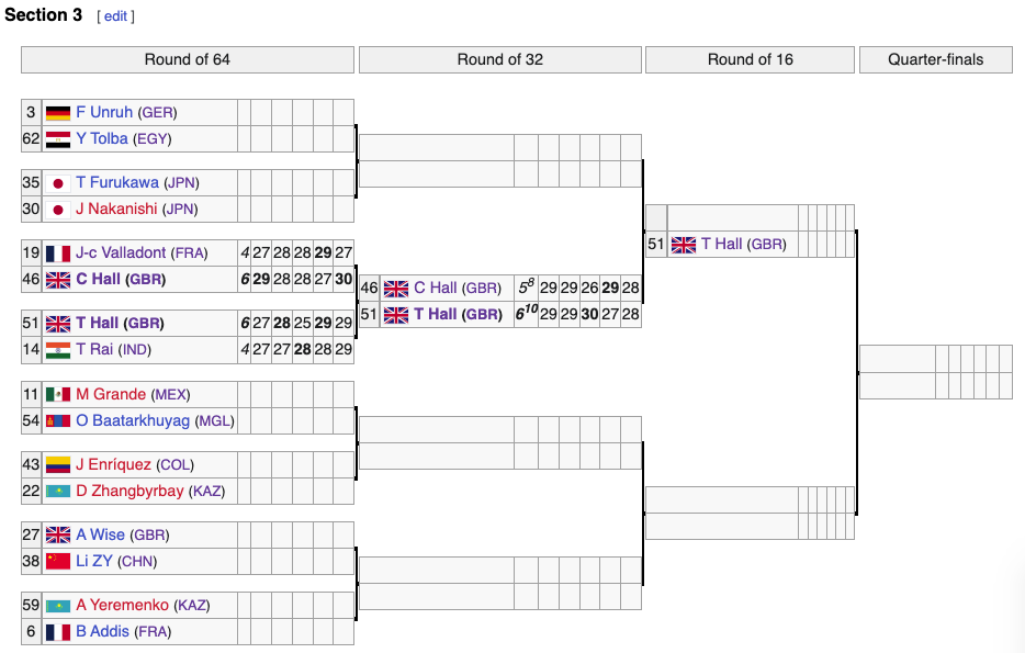 In section three during the round of 32, the fifty first seed Tom Hall of Great Britain upset the forty six seed Conor Hall of Great Britain. They both won one set and they tied three sets. In the shoot off Conor Hall got an eight and Tom Hall got a ten.