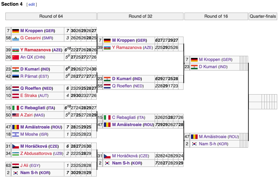 In section four during the round of 32, The twenty three seed Deepika Kumari of India beat the fifty five seed Quinty Roeffen of the Netherlands three sets to one. The forty seven seed Mădălina Amăistroaie of Romania upset the fifteen seed Chiara Rebagliati of Italy. Mădălina Amăistroaie won three sets, they tied one set, and Chiara Rebagliati won one set. The number two seed Nam Su-hyeon of South Korea beat the number thirty one seed Marie Horáčková of the Czech Republic. They tied three sets and Nam Su-hyeon won two sets.