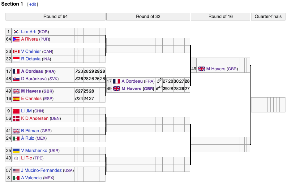 In section one during the round of 32, the number forty nine seed Megan Havers of Great Britain upset the number seventeen seed Amélie Cordeau of France. This one came down to another shoot off. Amélie Cordeau shot a nine and Megan Havers shot a ten.
