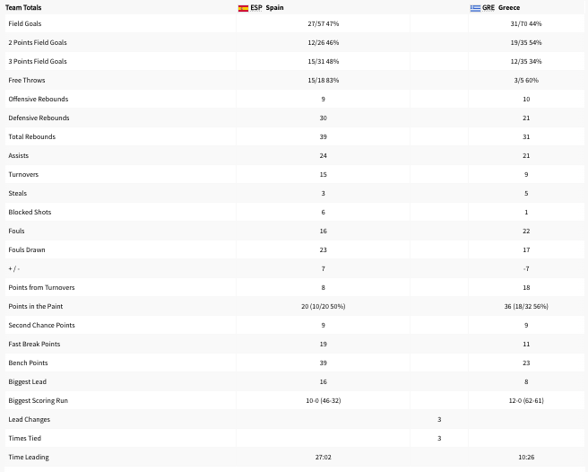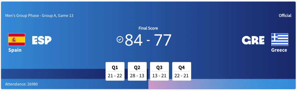 Spain played Greece. It was a Group A match. Spain was leading 49-35 at halftime. The final score was 84-77. Spain was outscored in the first and third quarters. Spain won by seven points. It was a close game. Spain will play Canada next. Greece will play Australia next.