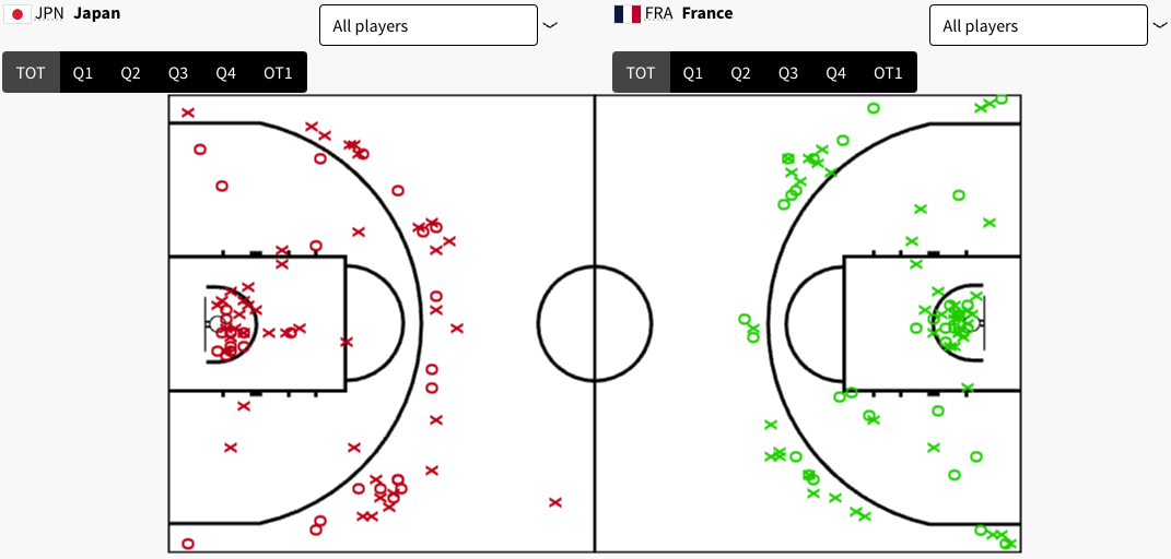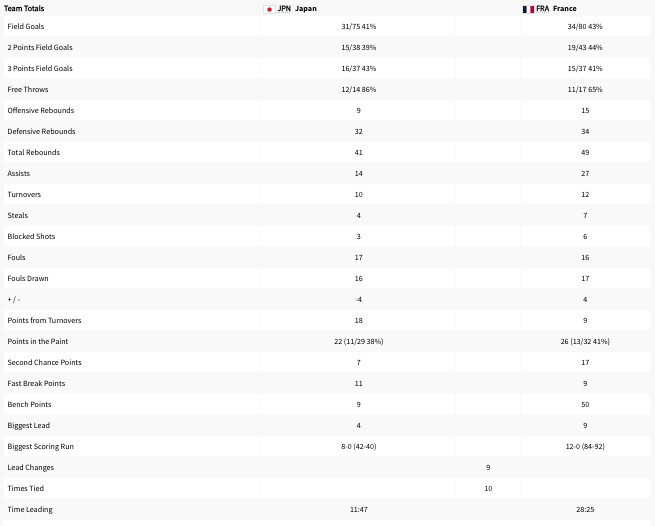 Japan played France. It was a Group B match. The score was 49-44 Japan at halftime. Japan had a big first quarter where they score 32 points. The score was tied at 84-84 after the fourth quarter. The game went into overtime. This was the first overtime game in basketball at Paris 2024. The final score was 94-90 France. Japan will play Brazil next. France will play Germany next.