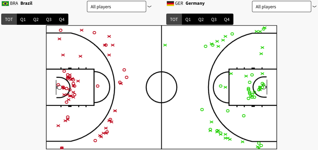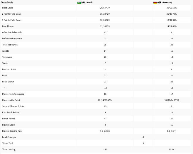 Brazil played Germany. It was a Group B game. The score was tied at 40-40 at halftime. The Final score was 86-73 Germany. The difference here was the inconsistency of the Brazilian scoring. Brazil scored thirty points in a single quarter but scored eleven or less in two different quarters. Brazil will play Japan next. Germany will play France next.